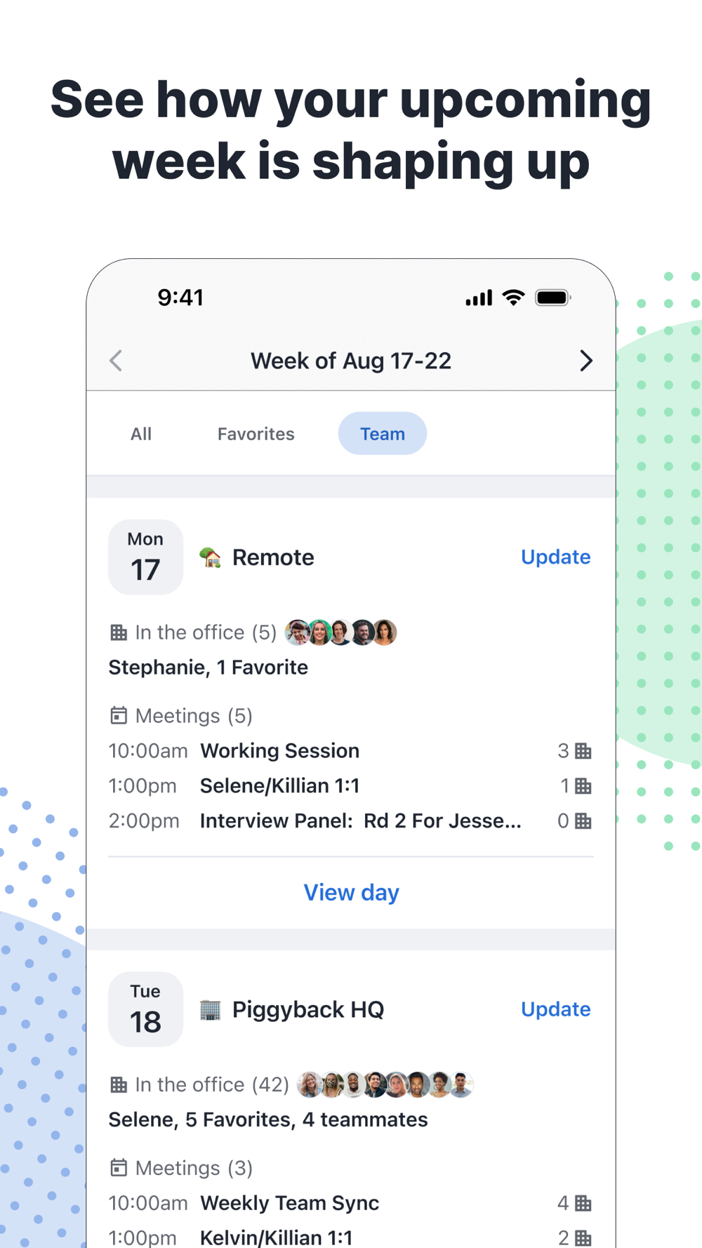 Get a quick rundown of your work week, including your co-workers’ office plans and upcoming meetings on your calendar.