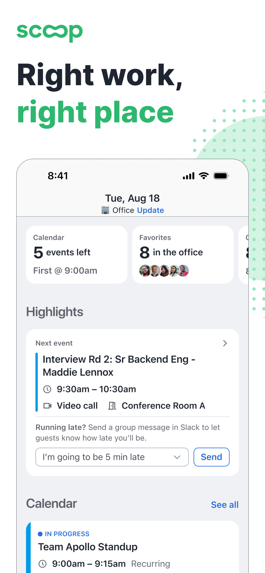“Scoop helps me know which colleagues are going into the office, which is super helpful for me to plan when to go into the office or what to expect when I get there—I love it!” - Megan G, Humu