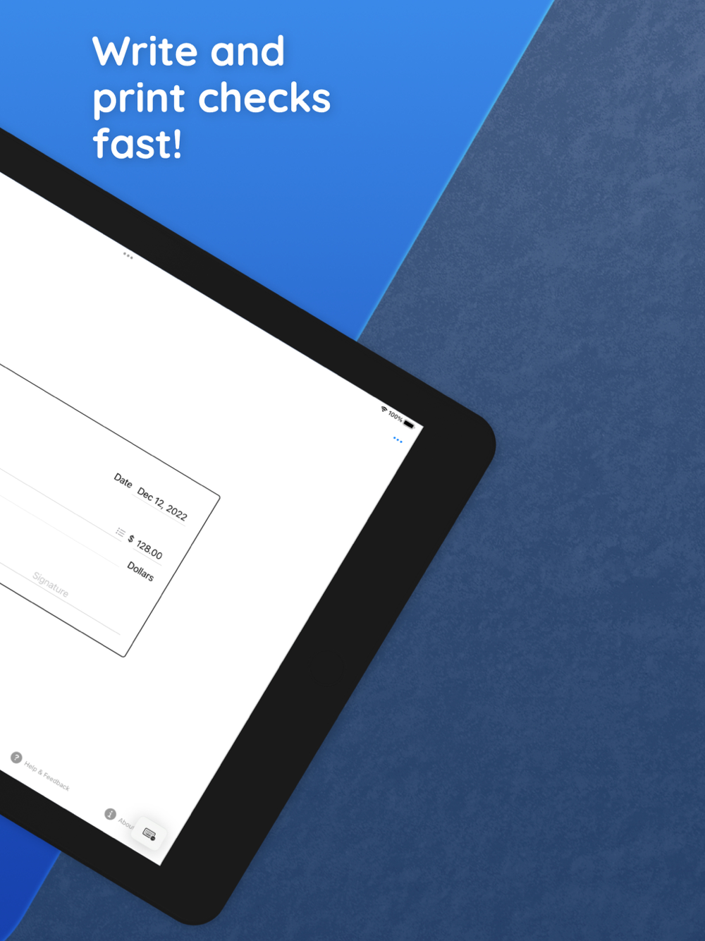 • No need to create an account in the app! Just install Check Writer, create a checkbook and start printing checks at home for free!