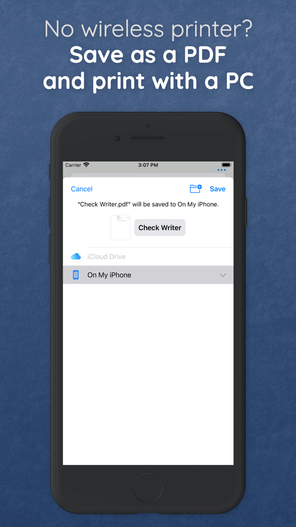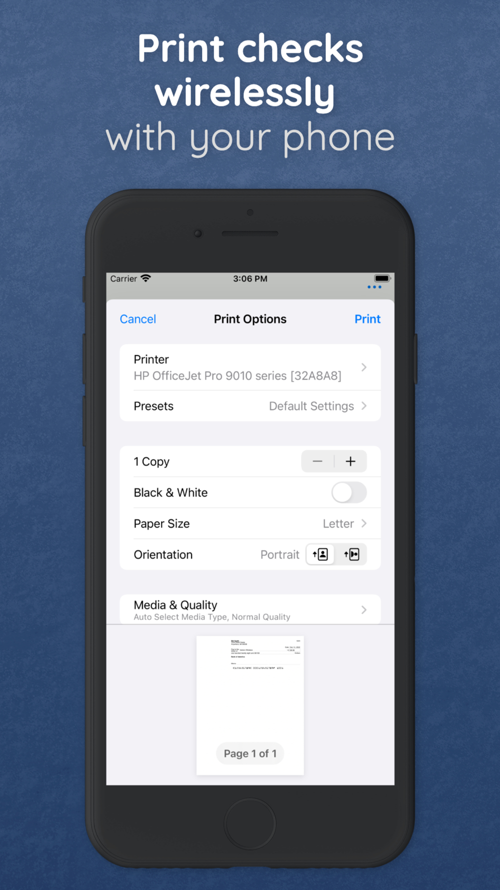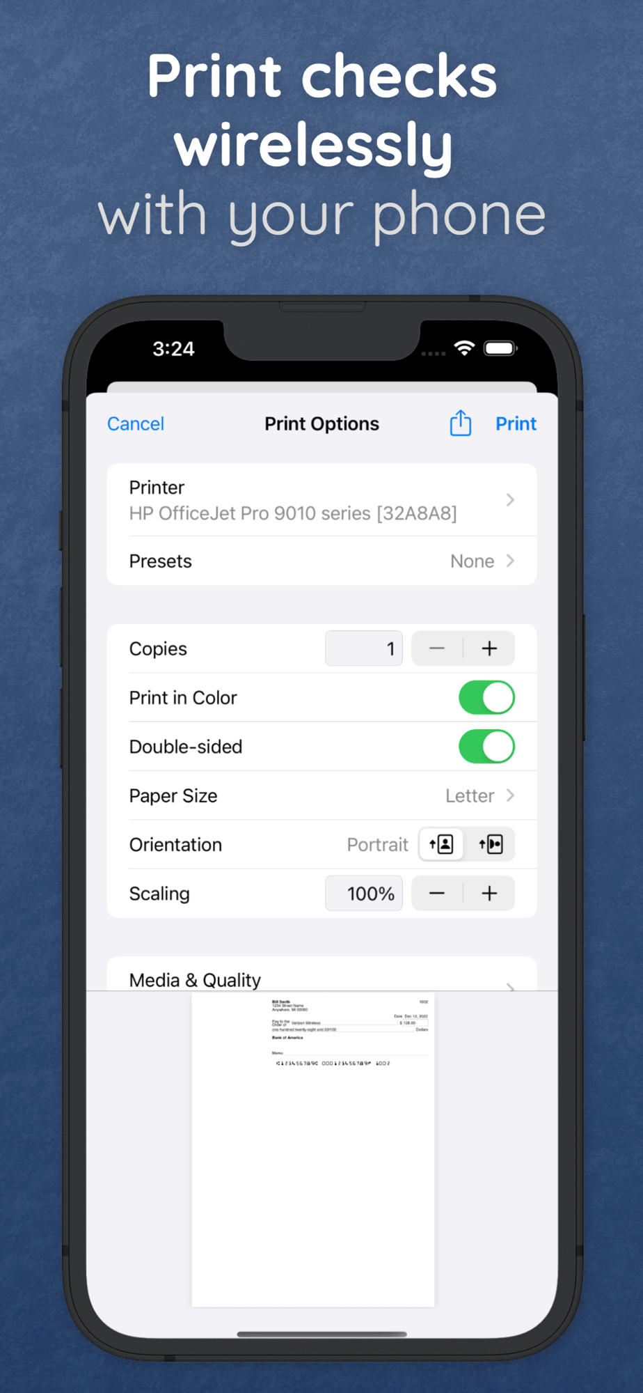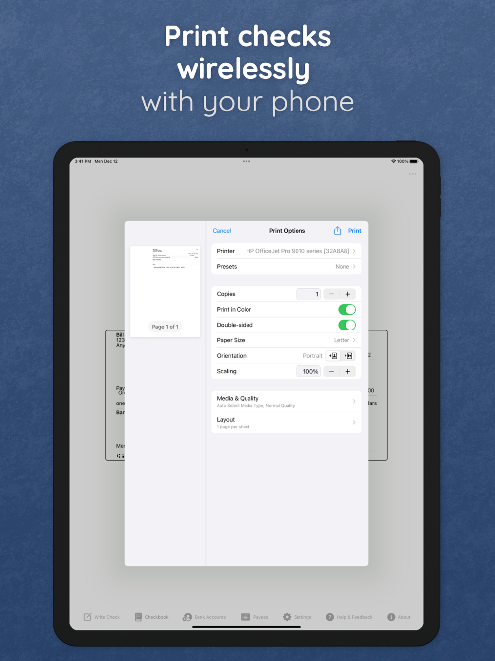 • Use your phone to print with a wireless printer. Or, create a check in the app, save it as a PDF file and send it to your computer for printing