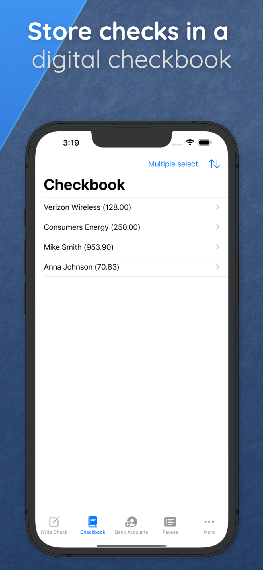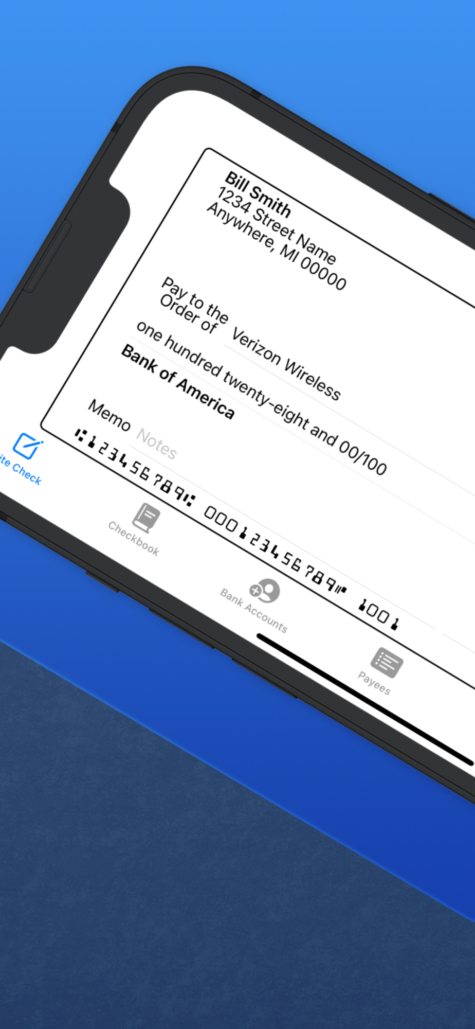 • Protects your privacy! Your information is stored locally on your phone and will never be uploaded to the Cloud or stored on a Check Writer server!