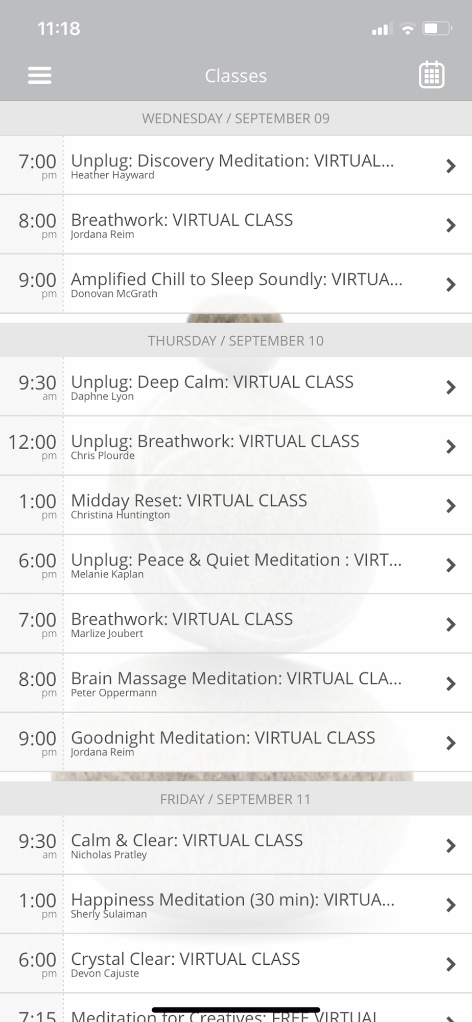 Download the Unplug Meditation In-Studio Booking App to plan and schedule your classes! From this App, you can view class schedules, sign-up for classes, view ongoing promotions, as well as view the studio’s location and contact information. You can also click through to our Facebook , Instagram and Twitter pages. Optimize your time and maximize the convenience of signing up for classes from your phone!