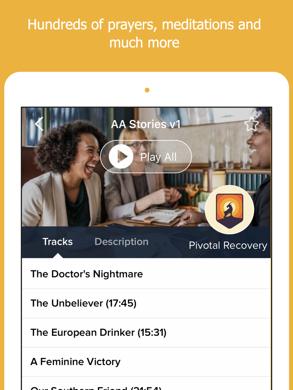 This app includes hundreds of hours of amazing content on drug abuse, recovery, Alcoholics Anonymous, and more. We add new stuff weekly. Here is a sample of audio content you will find: