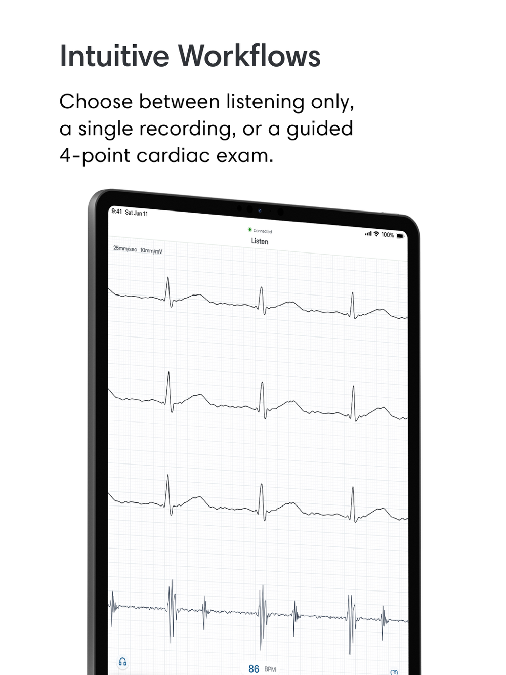- Record, play back, annotate, and save stethoscope sounds and ECG*.
