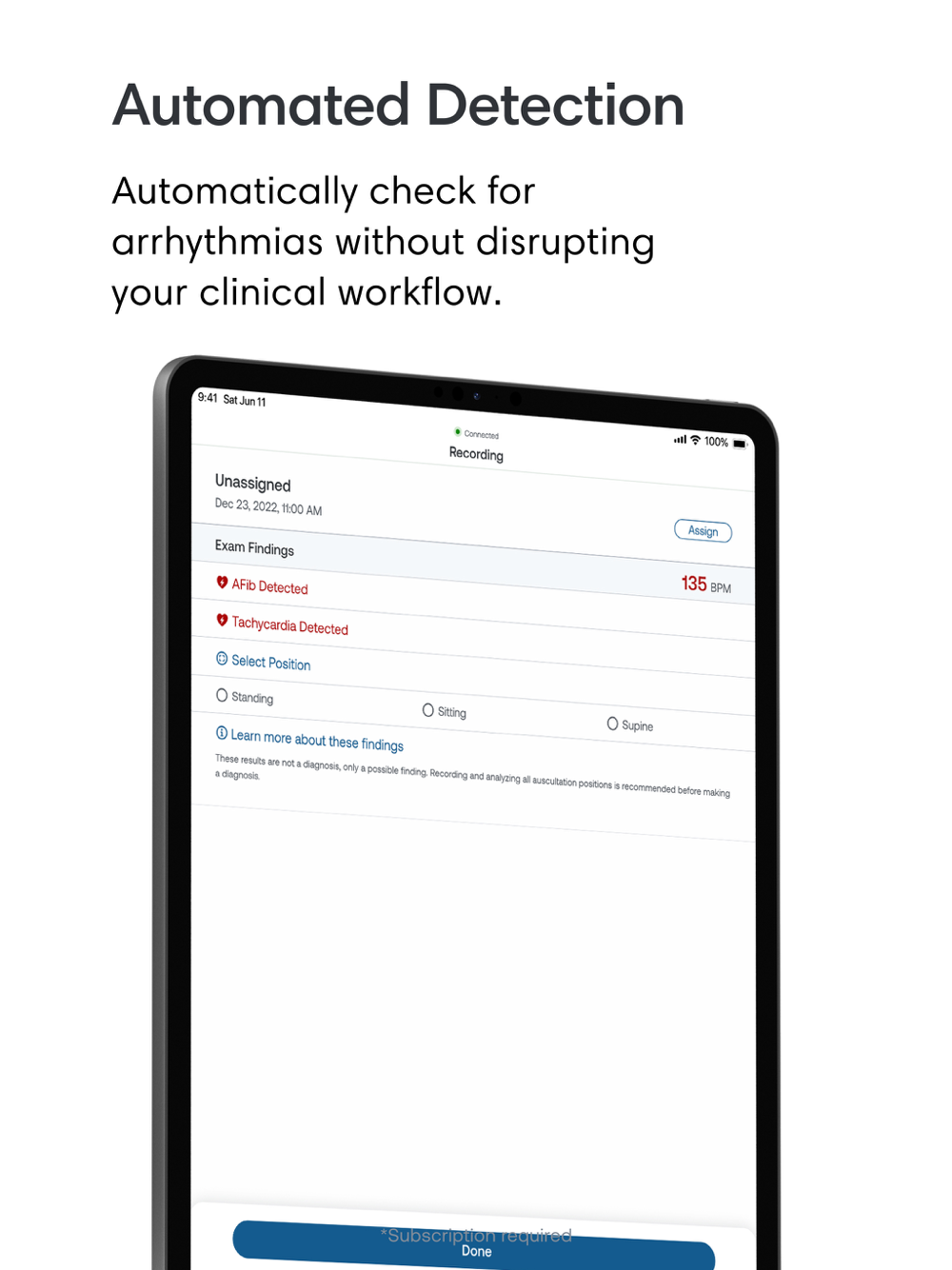 When connected to a compatible digital stethoscope, the Eko App automatically checks for arrhythmias during auscultation and rhythm assessments when recording analysis is enabled.