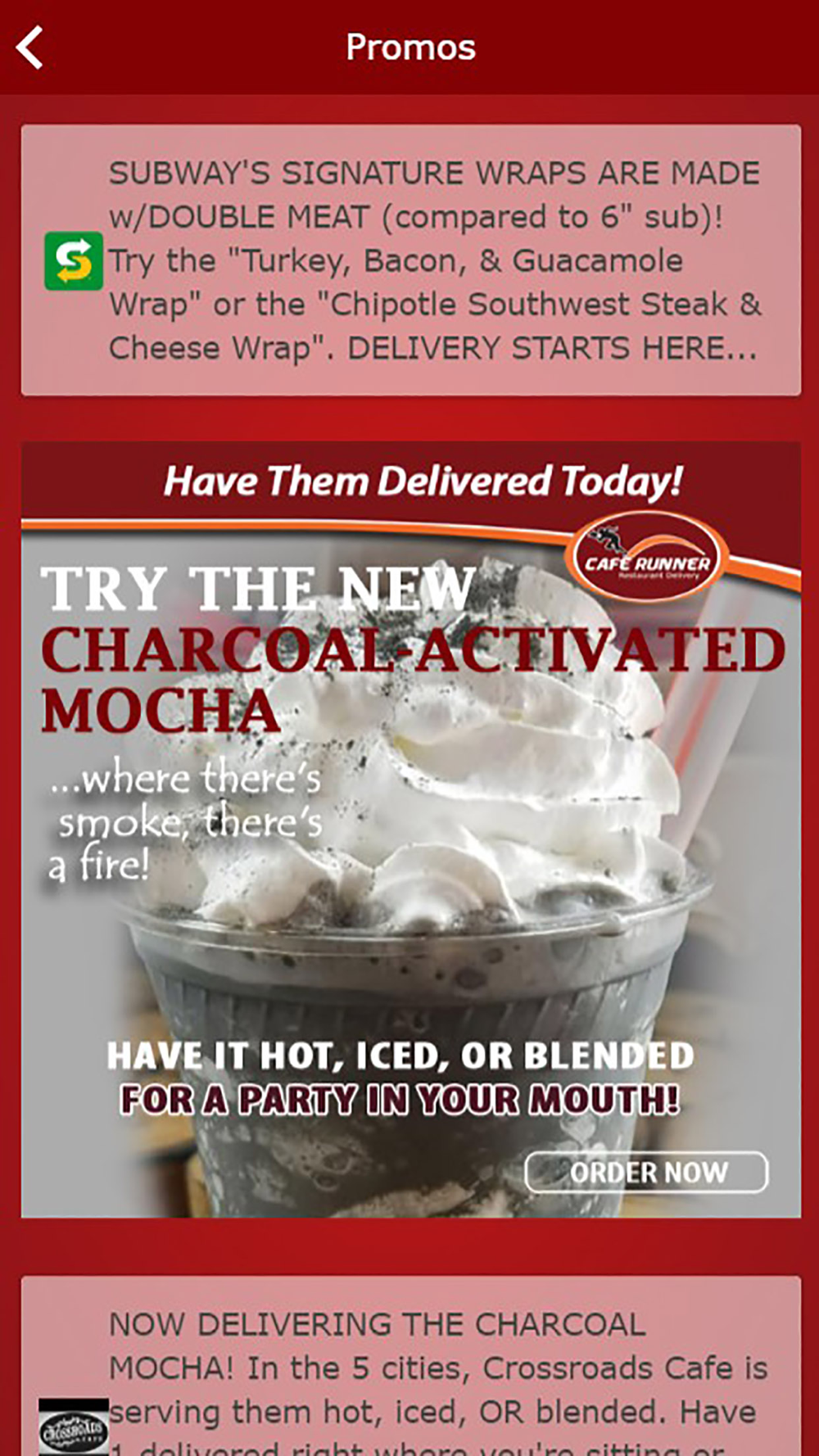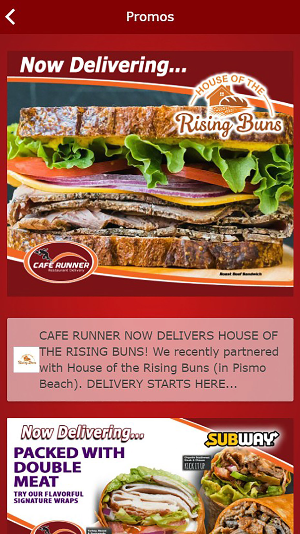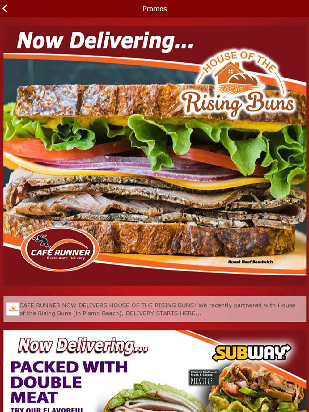 Cafe Runner is a multi-restaurant delivery system that delivers food from the best restaurants on the central coast at the click of a button. The company was founded in 1996 in Pismo Beach, CA. We spent over 20 years developing a delivery system that makes delivery quick, fun, and easy...the way it should be! We guarantee you'll get everything you ordered, hot food hot, and reasonably fast or on time...or we'll make it up to you. Enjoy!