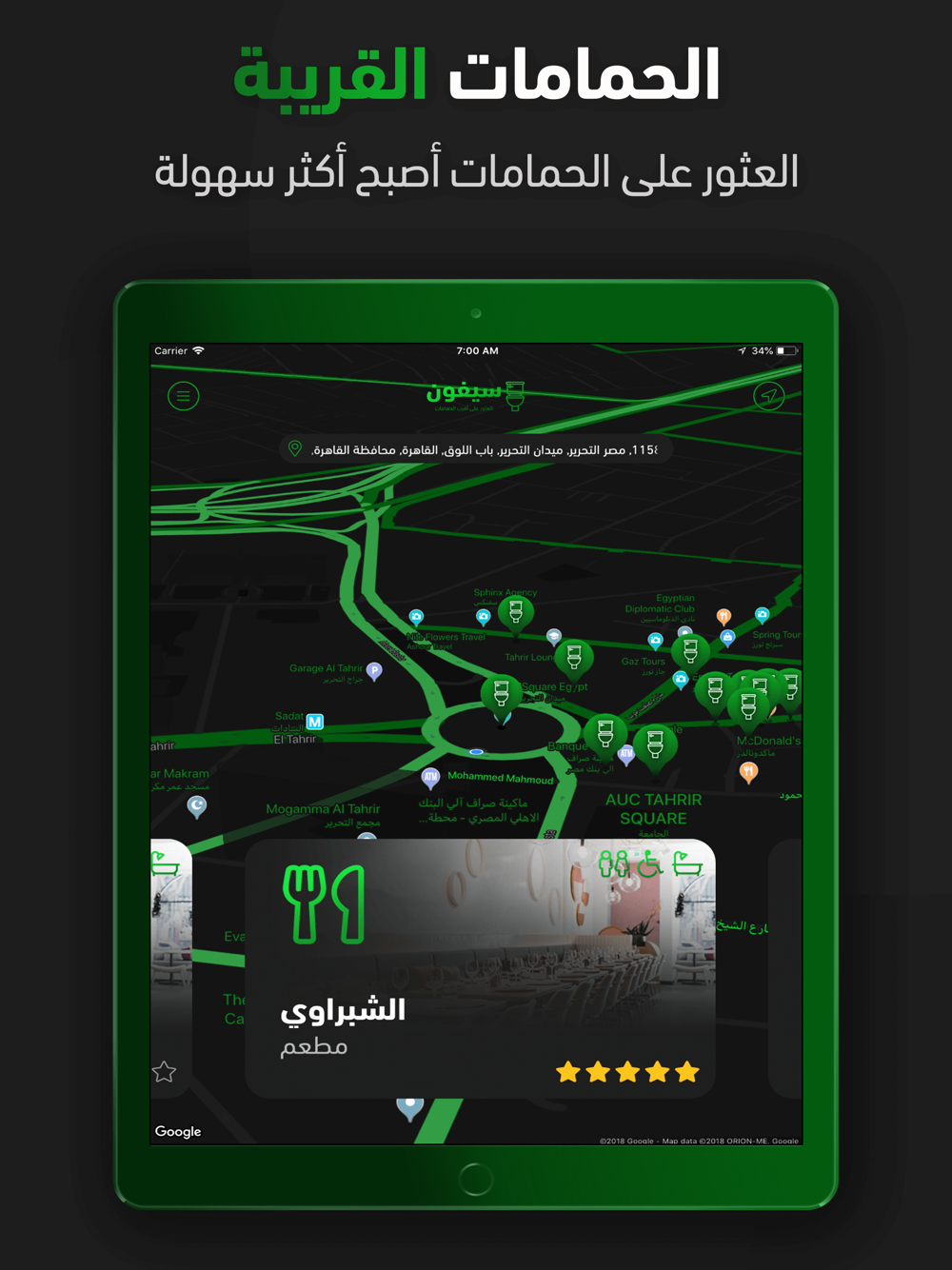 تطبيق سيفون هو اول و اسرع و اسهل تطبيق يحدد لك اقرب الحمامات. مع اكثر من 20,000,000 حمام في العالم, سيفون هو التطبيق الوحيد الذي لديه دقة عالية جدا في إيجاد الحمامات القريبة علي أن مسافة اقرب حمام اليك لن تتجاوز 1 كم. يمكنك عرض جميع بيانات الحمامات مثل النوع والاسم والتقييمات والعنوان، وفتح الحمام في خرائط جوجل للحصول على الاتجاهات بكل بسهولة، أو تقييم الحمام ومشاركة تجربتك مع الحمام مع الآخرين.