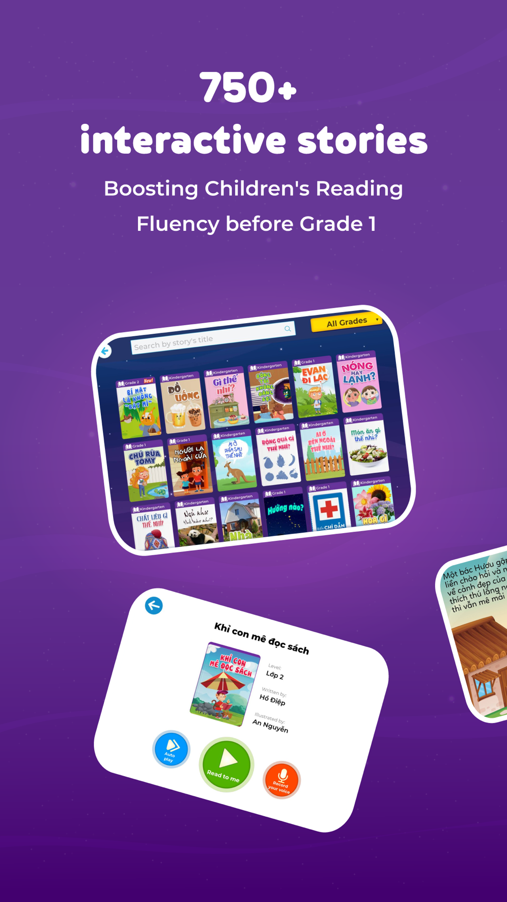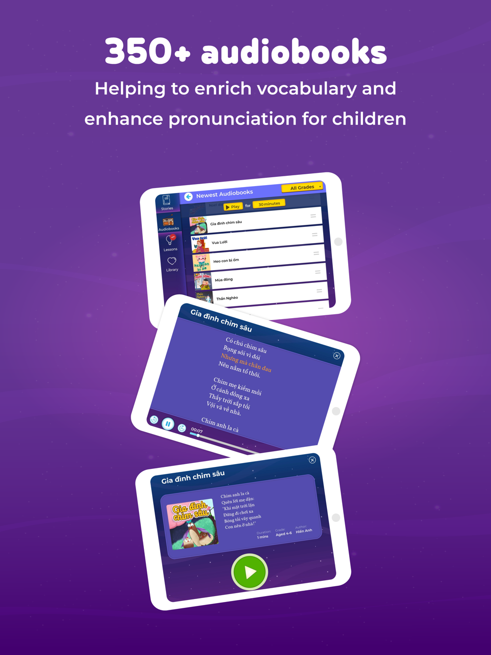-750+ interesting stories and 350+ audiobooks divided into many levels suitable for the ability to acquire language and daily activities of children in Kindergarten and Primary School. New stories are updated weekly.