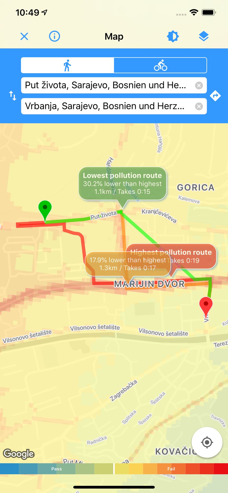 > Type your start and destination into the search box, hit the arrow and the app will display two or three alternative routes and calculate the pollution difference between them.