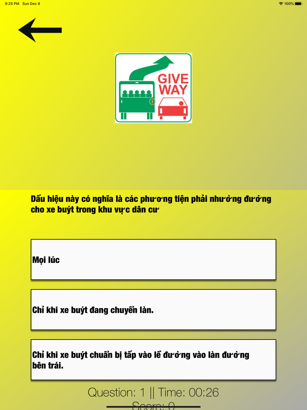 Chương trình thi thử bằng L của bang Victoria Australia. Các câu hỏi được lấy tử cơ sở dữ liệu chính xác của vic roads nên cực kì sát với đề thi. Đảm bảo 90% câu hỏi sẽ tương tự khi bạn đi thi thật. Nếu bạn làm khoảng 10 tests với chương trình này và số điểm của mỗi test đều trên 290 thì 100% bạn sẽ thi đỗ khi đi làm bài thi thật. Đáp án hiển thị sau câu trả lời của bạn.