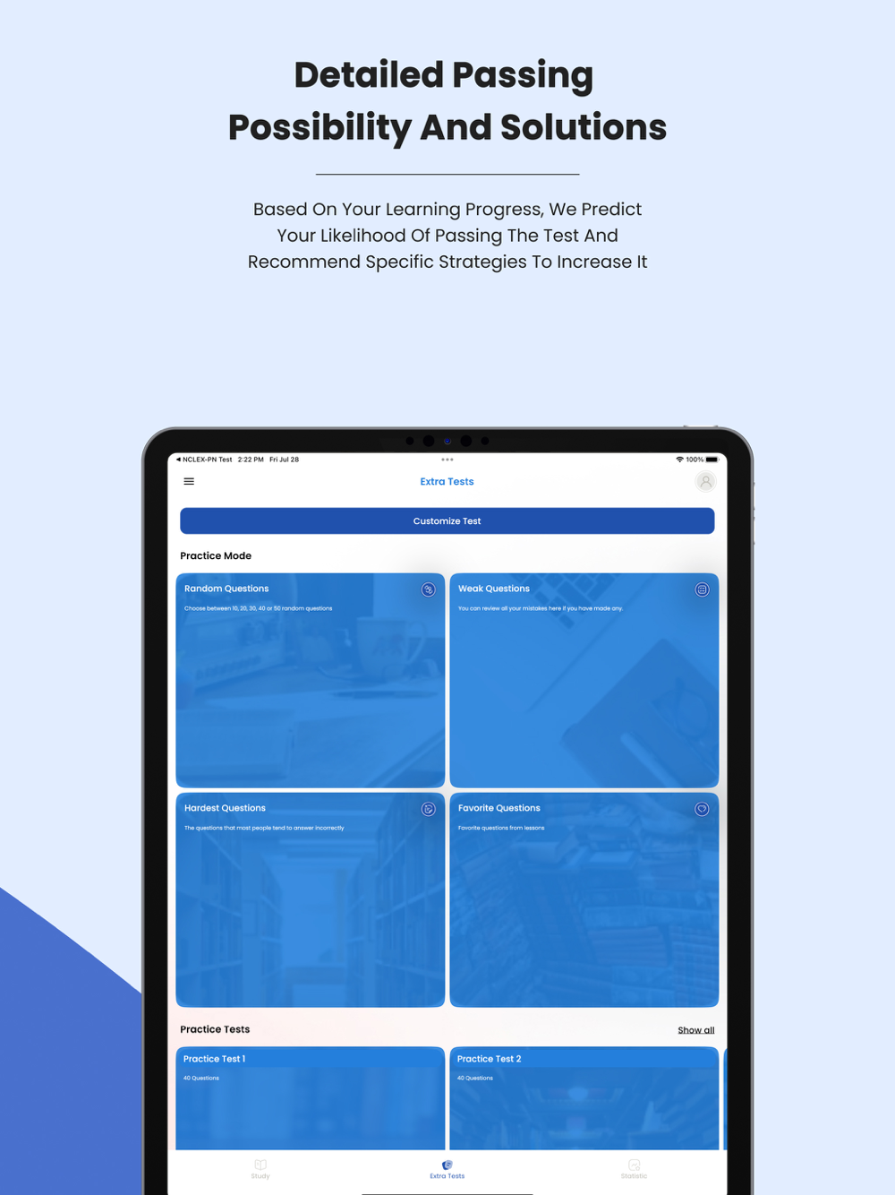 Our NCLEX-RN Practice Test is organized to closely follow the actual objectives of the NCLEX-RN exam. There is a lot to know and our practice tests for the NCLEX-RN Exam will help you find out where you need to improve and make the most of your study time.