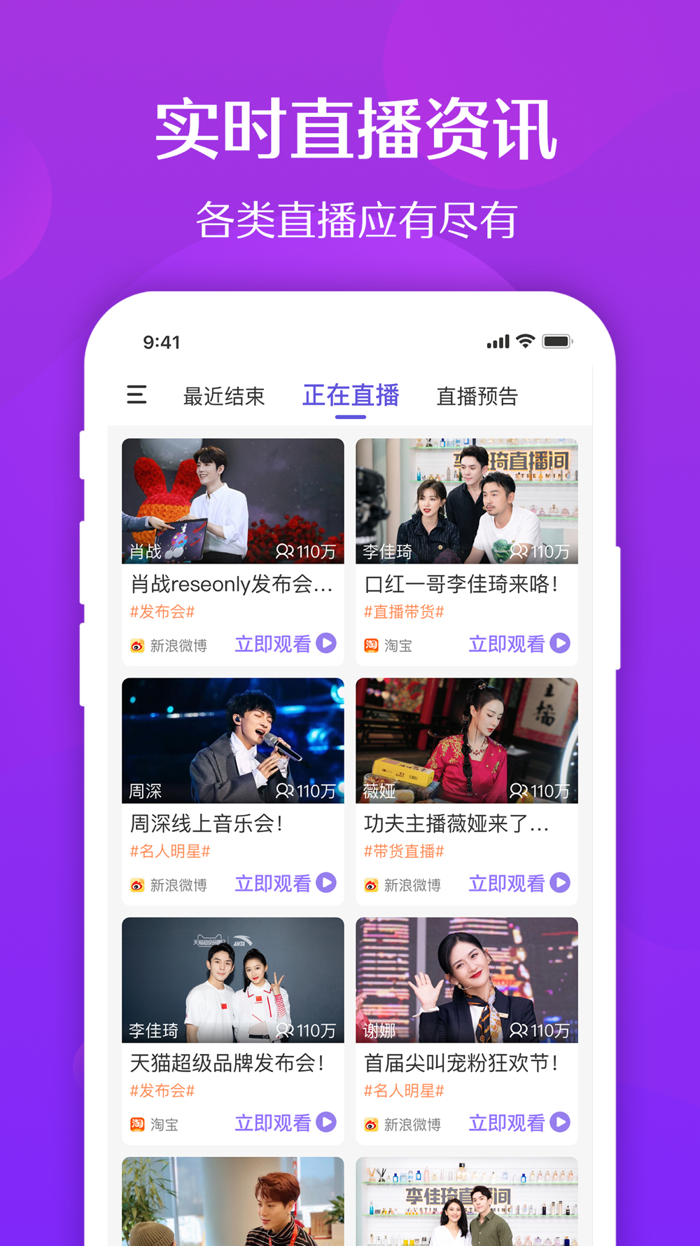 【实时直播资讯】:展示各大直播平台正在直播的内容,点击直接观看,可一键跳转至直播间;