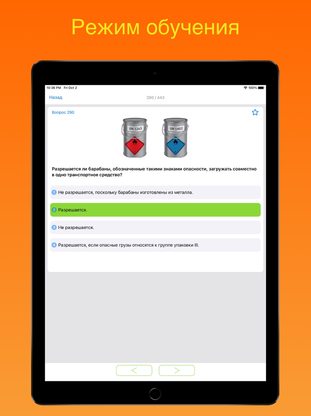• Подготовка - Позволяет изучить вопросы в текстовом формате с отмеченными правильными ответами;