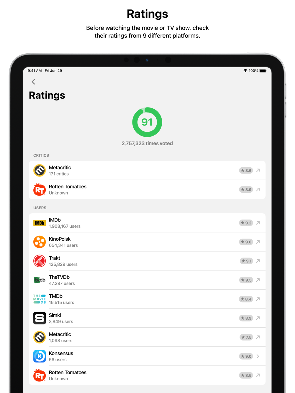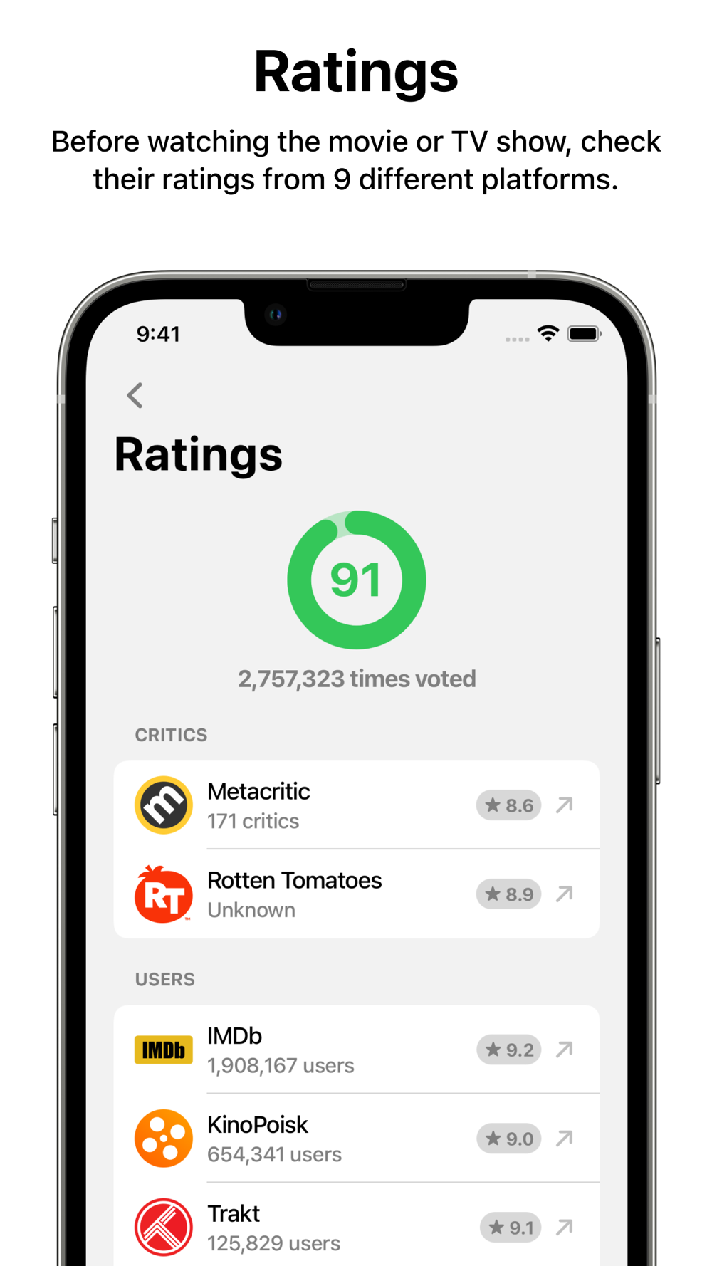 Before watching the movie or TV show, check their ratings from 9 different platforms.