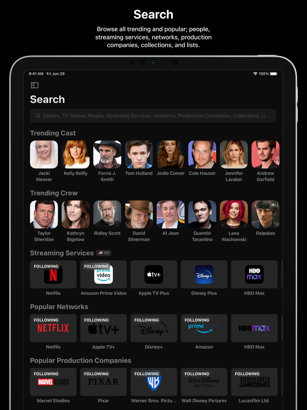 Browse all trending and popular; people, streaming services, networks, production companies, collections, and lists.