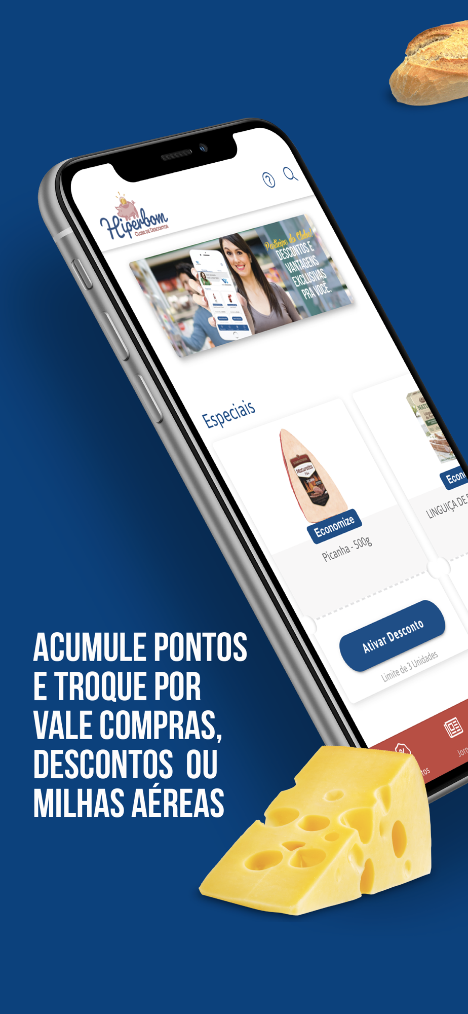 Aplicativo que fornece descontos exclusivos para os participantes do Clube HiperBom, de acordo com o perfil de compra de cada um. Além disso, os clientes acumulam pontos a cada compra realizada, e esses pontos podem ser trocados por cupons de descontos, vale compras e milhas aéreas.