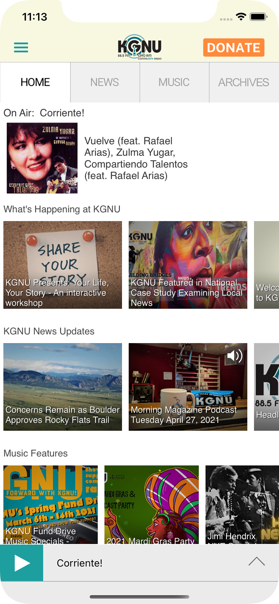 • One click stream switching – flip between KGNU, AfterFM, and our podcasts in an easy click!