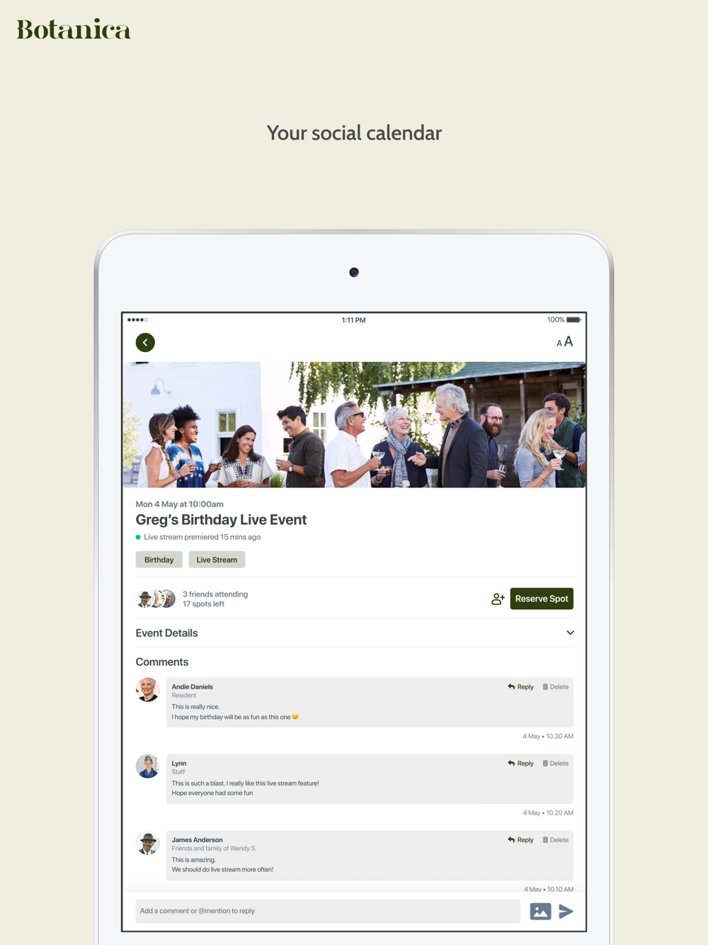 The Botanica Lifestyle environment has been designed to help residents connect and communicate with each other and the organisation. It helps create a vibrant, digital social layer around a community and is available on all of the residents favourite devices.