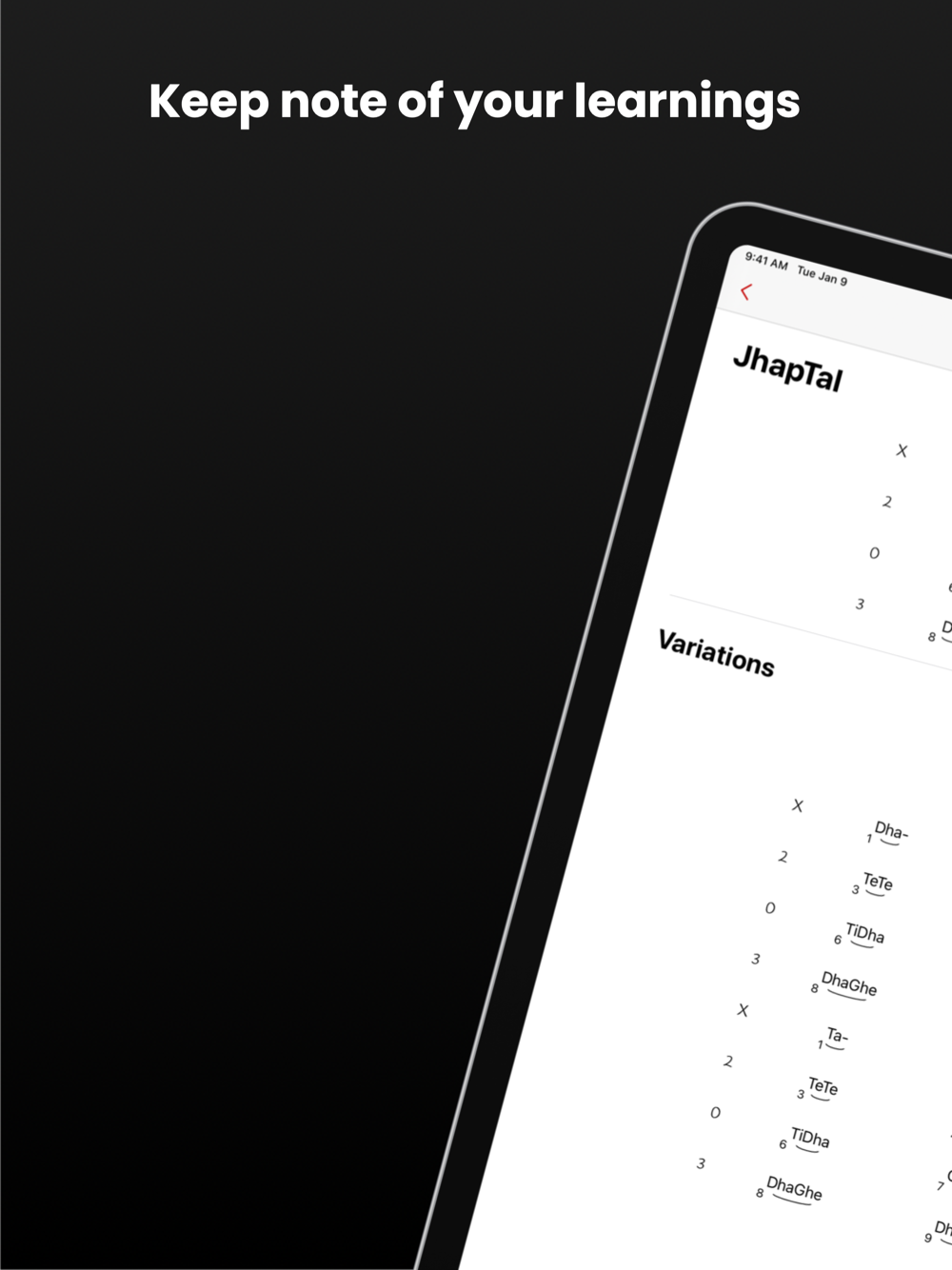 Store Taals and variations on your phone or tablet with Paltas. Notes and compositions are presented beautifully in Bhatkhande notation adapted to fit well on your device.