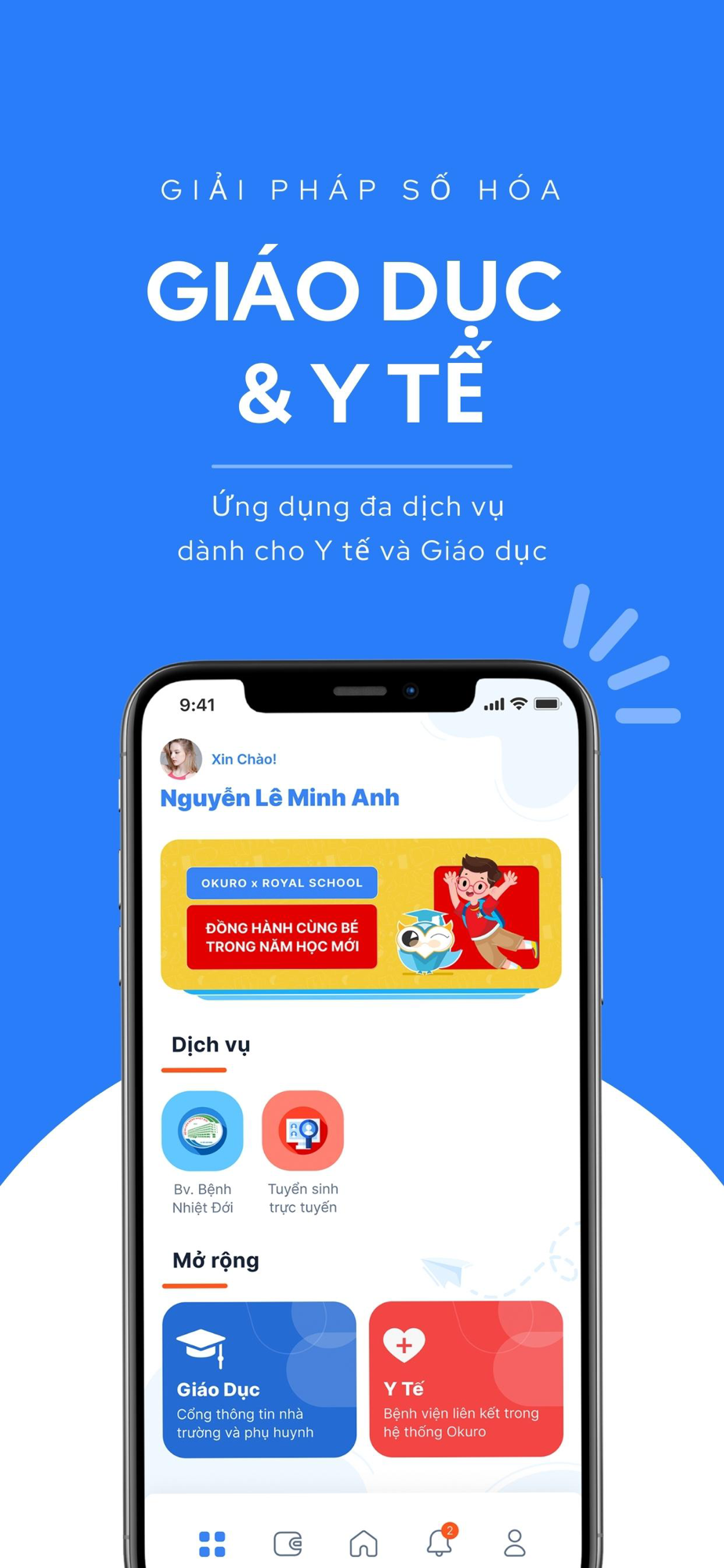 Chào mừng bạn đến với Okuro - Ứng dụng số hóa chuyển đổi công nghệ đầu tiên trong 2 lĩnh vực Giáo dục và Y tế. Chúng tôi cung cấp các tiện ích như đặt lịch khám, thanh toán, đóng học phí, quản lý về sức khỏe và việc học cho con em và gia đình.