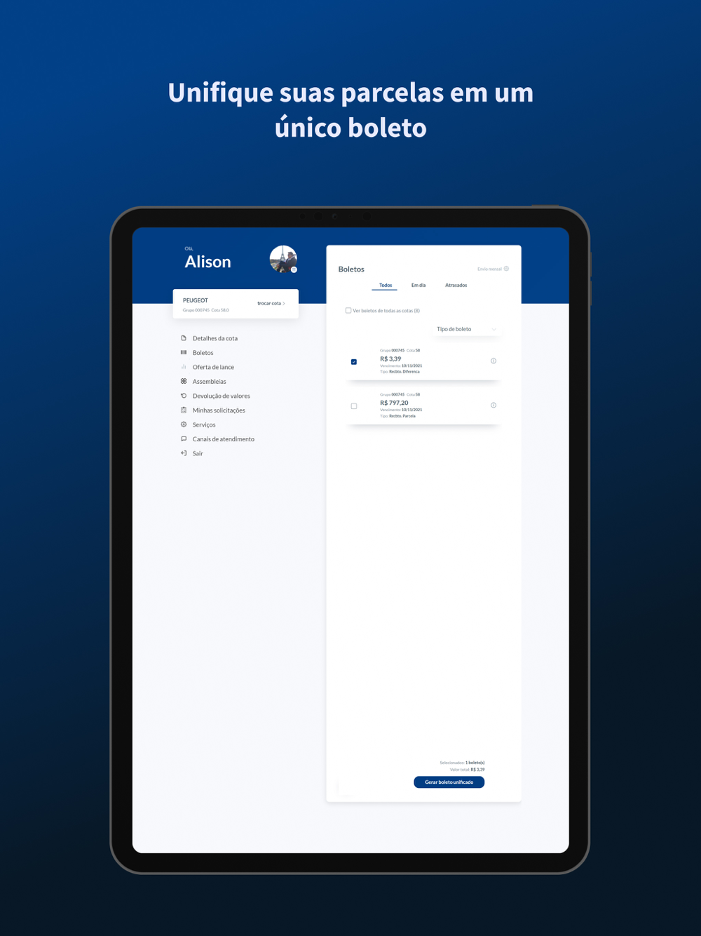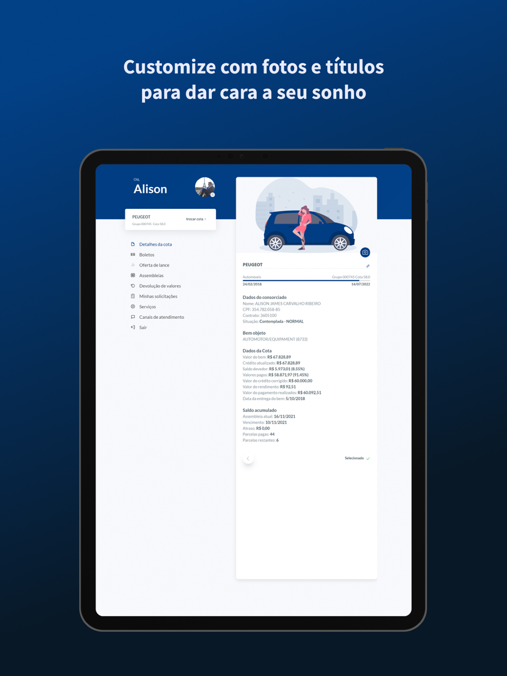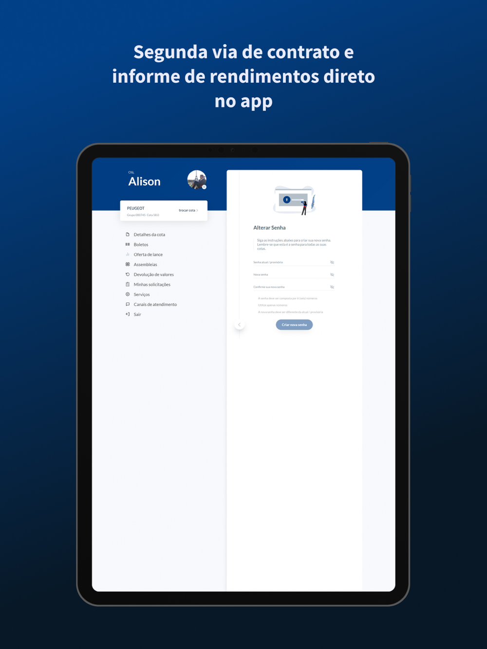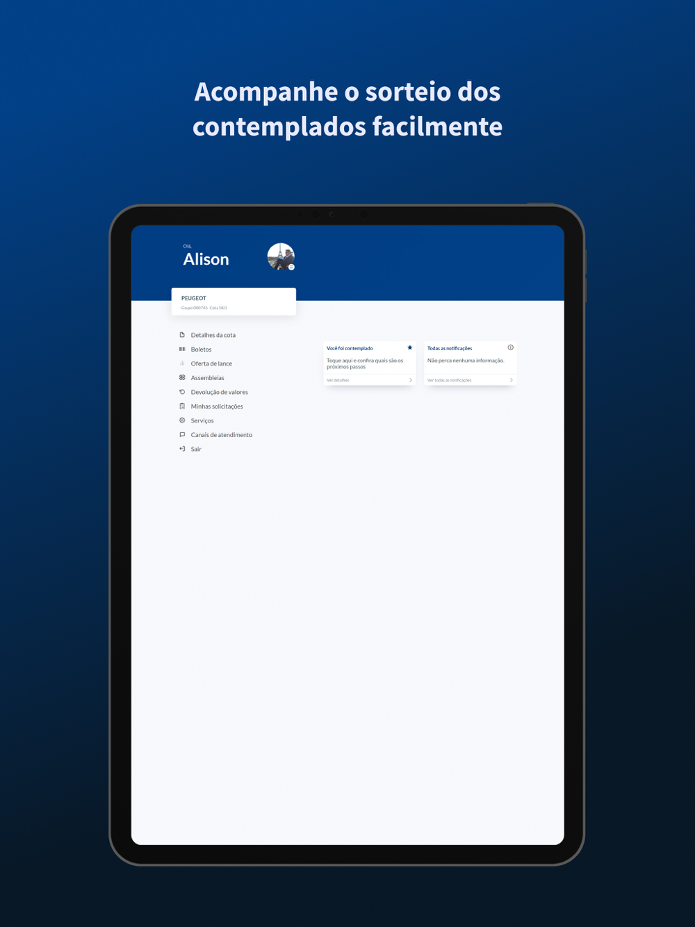 Você pode ofertar lances, conferir as datas e os resultados das assembleias, emitir segunda via de boleto e muito mais.