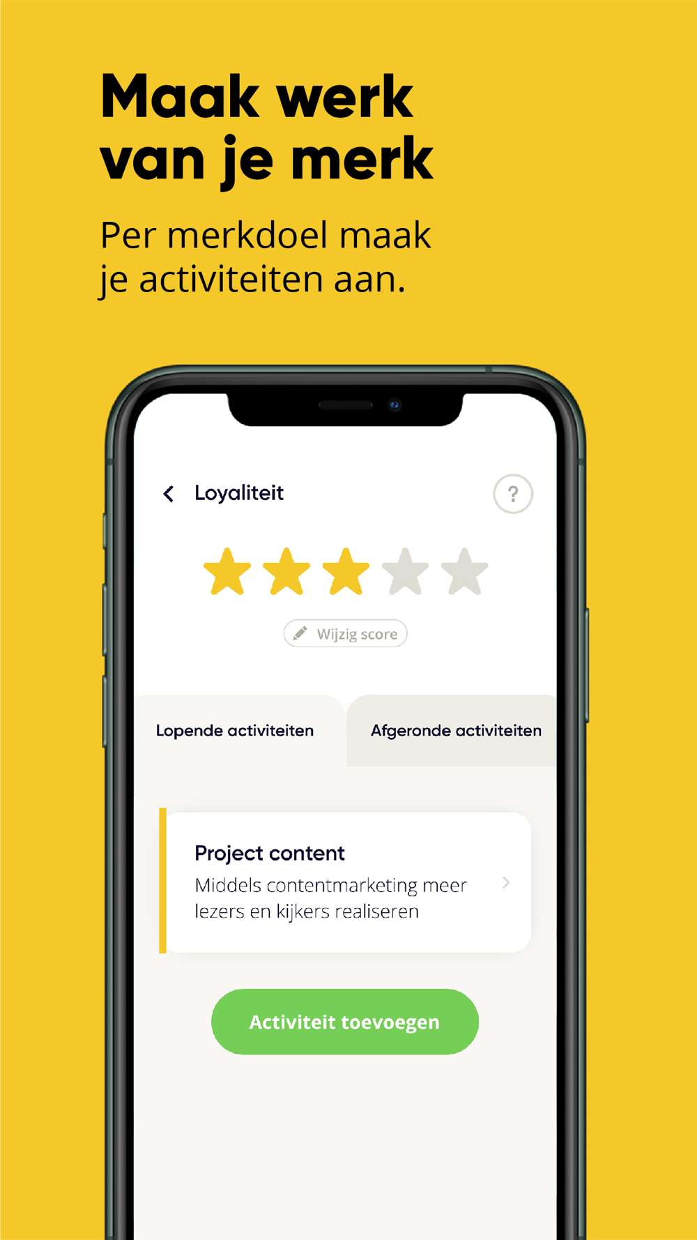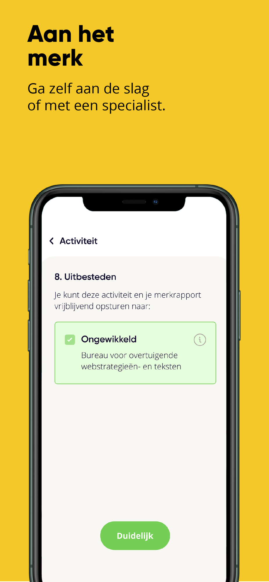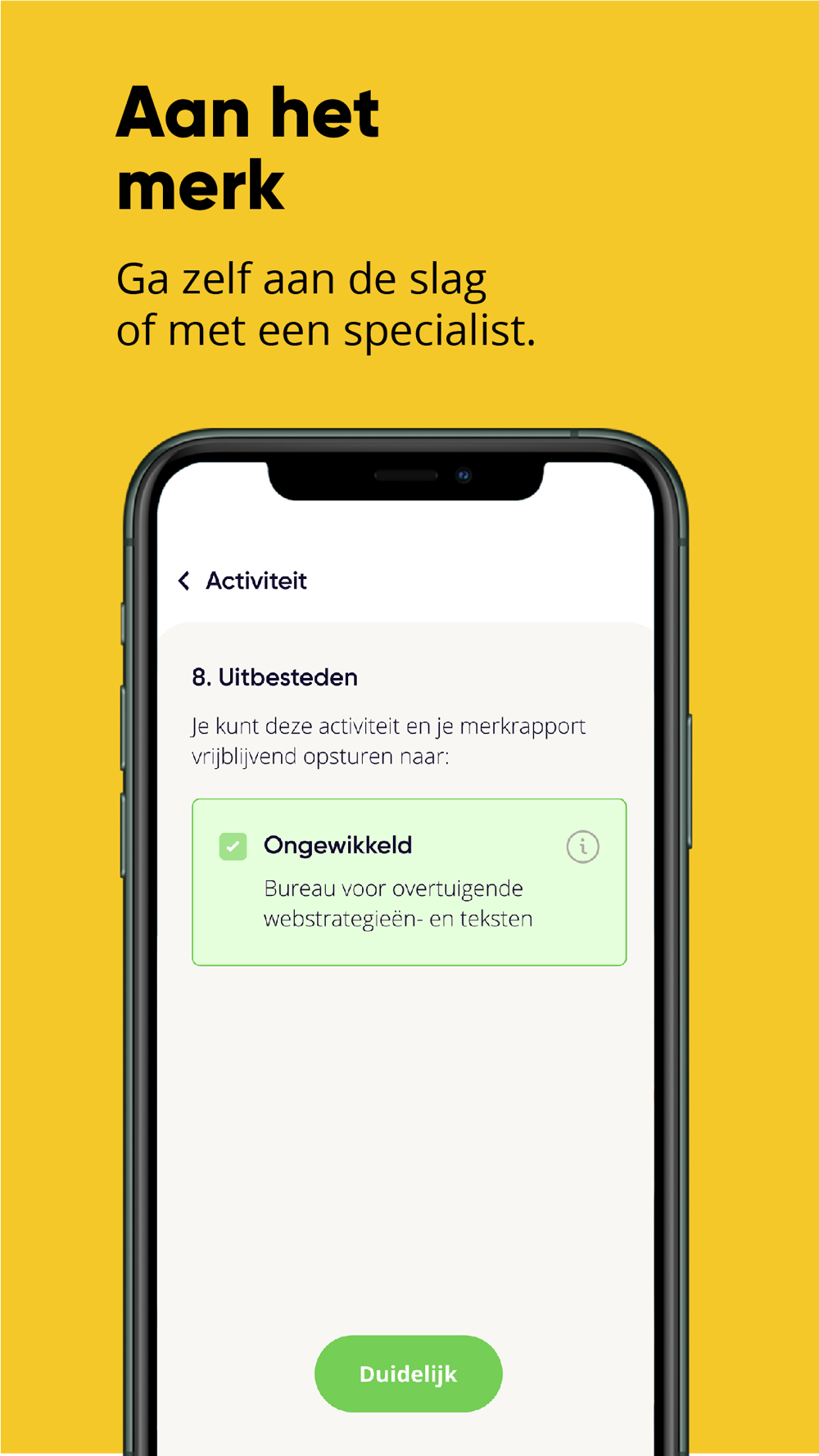 Is je merkscore voor verbetering vatbaar? Dan kun je per merkdoel een activiteit aanmaken. Elke activiteit start met het kiezen van een marketingmiddel. Je krijgt per middel een uitleg over hoe je het in kunt zetten voor het merkdoel in kwestie. Daarna volgen er nog een aantal optionele keuzes om de activiteit verder te specificeren. Activiteit compleet? Dan kun je er zelf mee aan de slag of direct vanuit de app (vrijblijvend) de hulp van een specialist inschakelen!