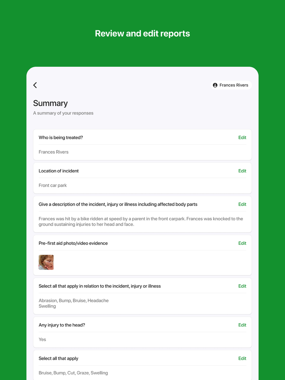 Every single report checks on whether an injury to the head has been sustained; users can record the smallest of bumps to serious signs and symptoms of concussion.