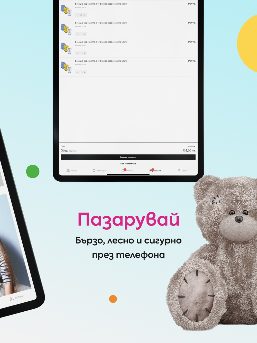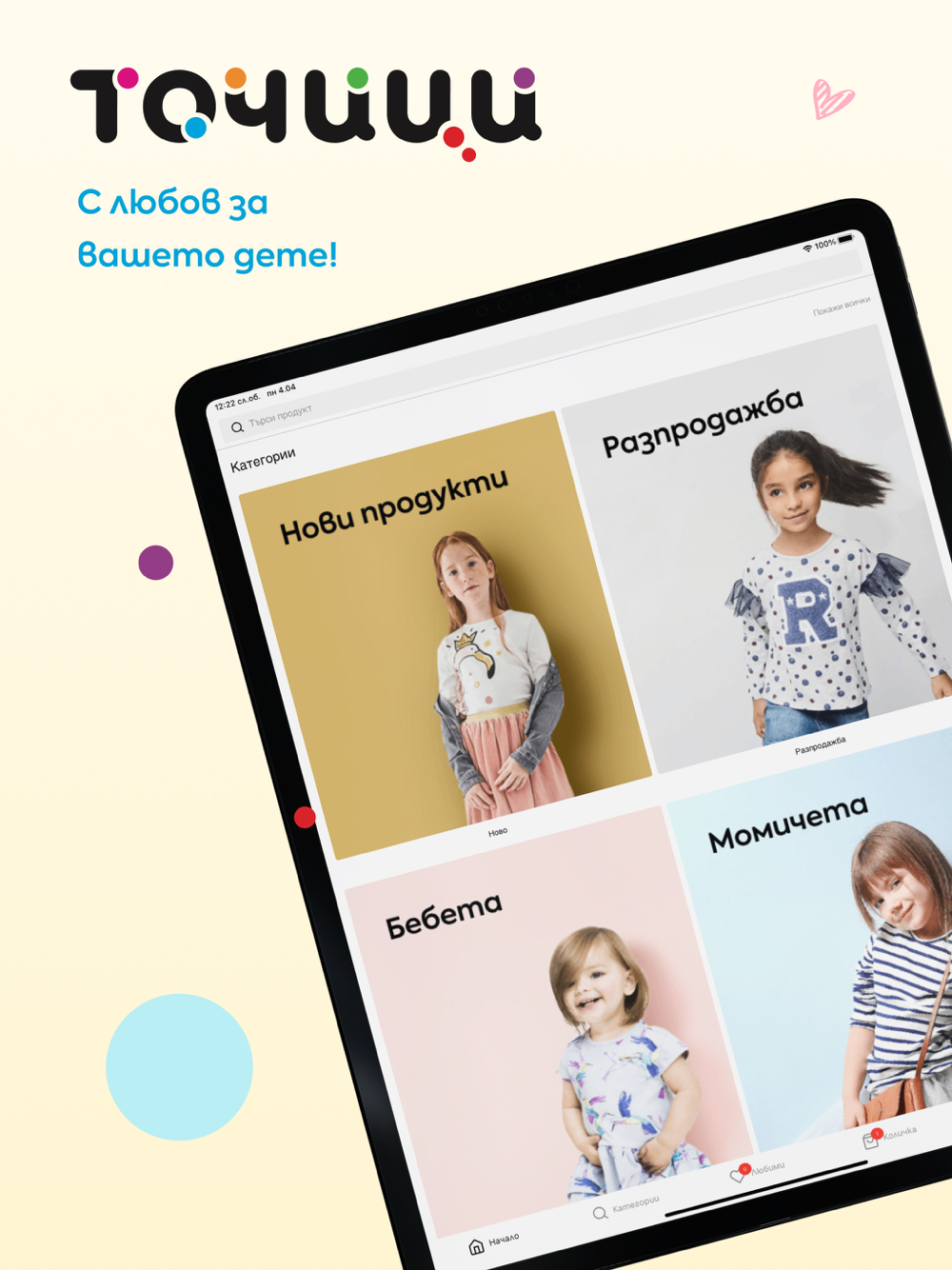 Чрез мобилното приложение на Точици може да откриете лесно и бързо необходимите дрешки и аксесоари, да запазите желаните продукти в “любими”, както и да завършите покупка си само с няколко клика!
