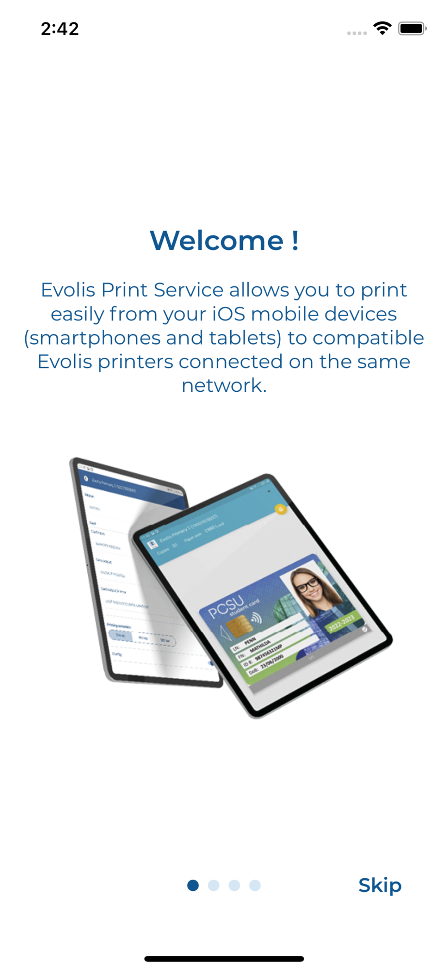 Once installed, the application allows you to add and associate Evolis printers present on the same network as the mobile device (Ethernet or Wi-Fi connected printer) and then to offer printing plugin from your iOS device to compatible Evolis printers.