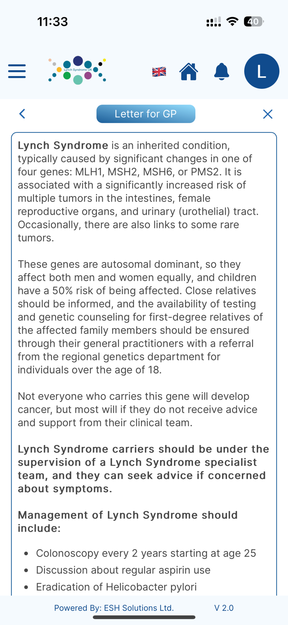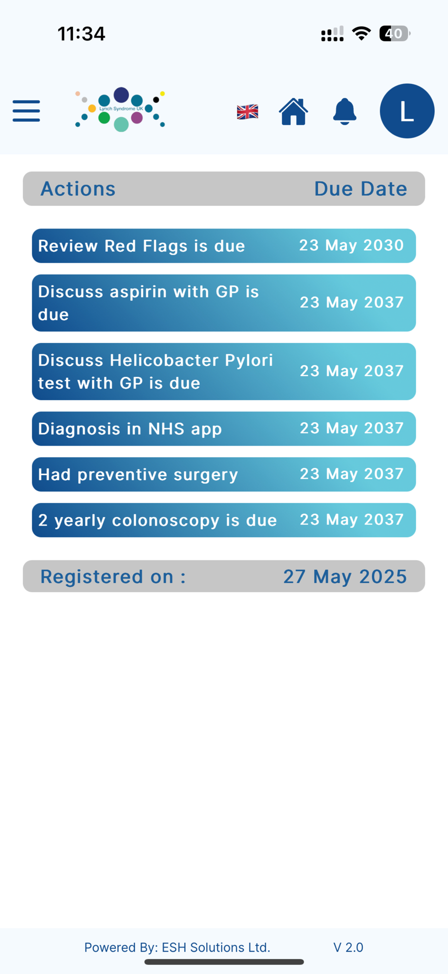 The app provides NHS-approved information, support, and guidance to Lynch Syndrome carriers plus automatic alerts, reminders, and follow-up for all the NHS-recommended Lynch Syndrome screening checks.