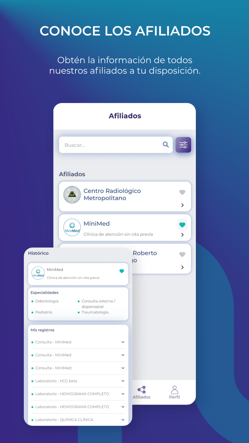 Acceder en cualquier momento a sus datos de salud e historial clínico de forma rápida y segura. Desde BIENI se podrá consultar estudios de imagenología, laboratorio y consultas médicas de los diversos afiliados.