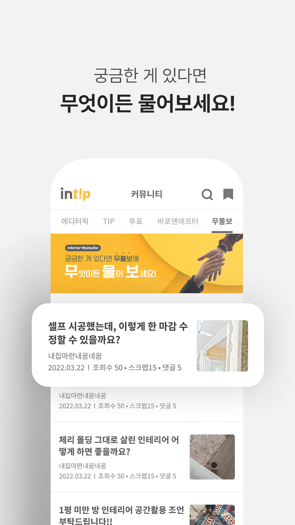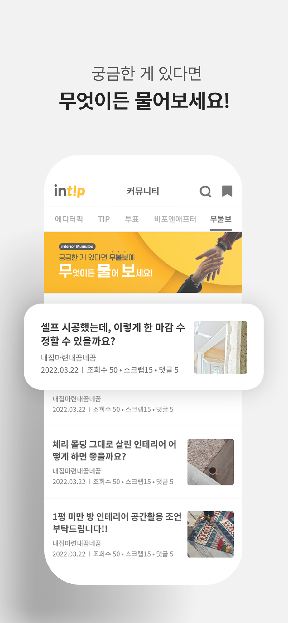 에디터픽, TIP, 투표, 비포앤애프터, 무물보까지 여러 카테고리별 소통공간을 통해 다양한 인테리어 정보를 얻을 수 있어요