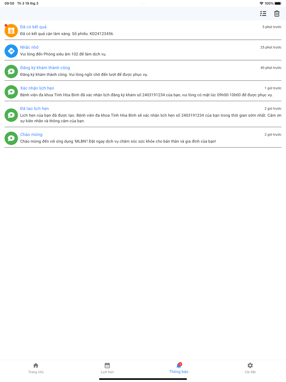 6. Nhận được thông báo kết quả cận lâm sàng khi có kết quả, thông tin đơn thuốc, chi phí khám chữa bệnh...khi kết thúc khám chữa bệnh.
