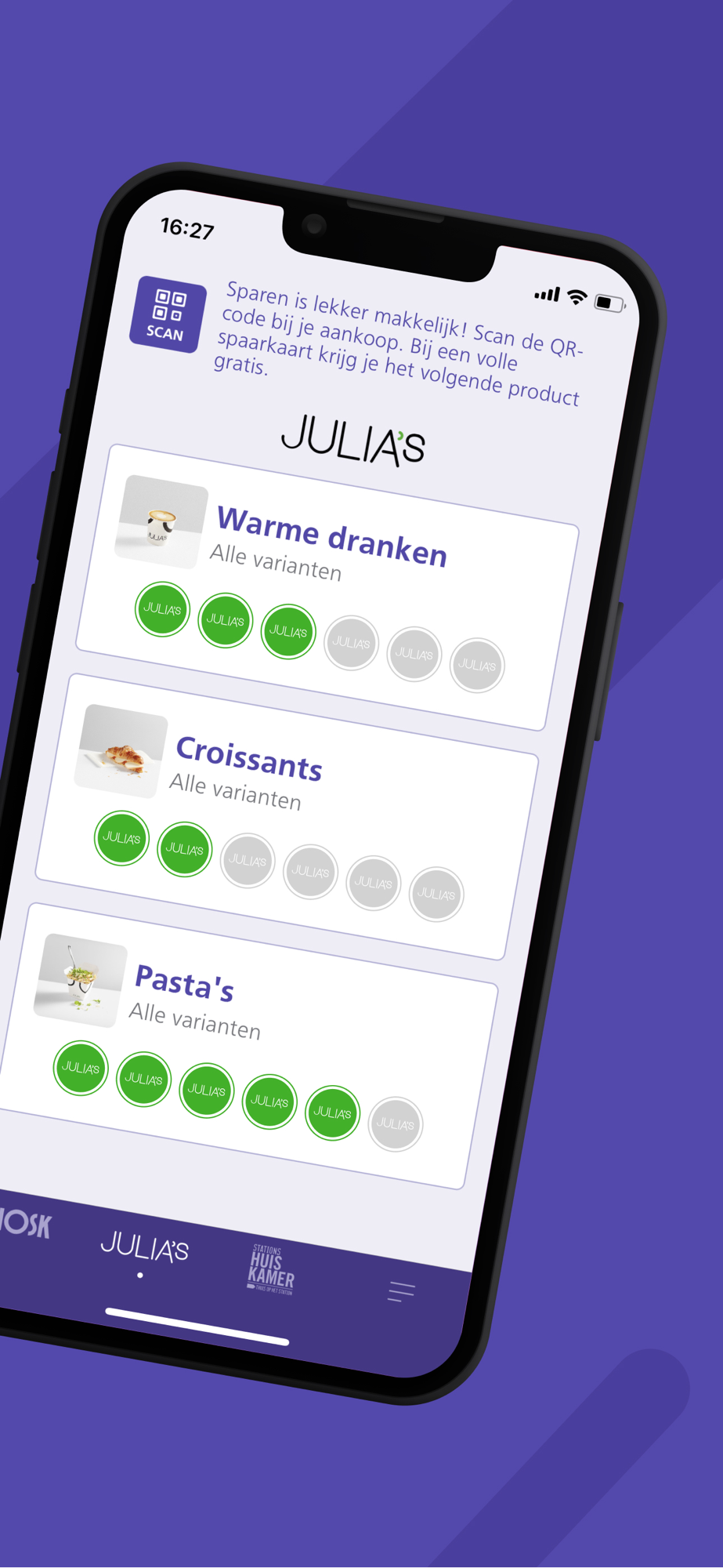 • Alle spaarkaarten en gespaarde zegels voor de winkels van Kiosk, Julia’s, Luca’s by Julia’s en StationsHuiskamer, gemakkelijk in één app.
