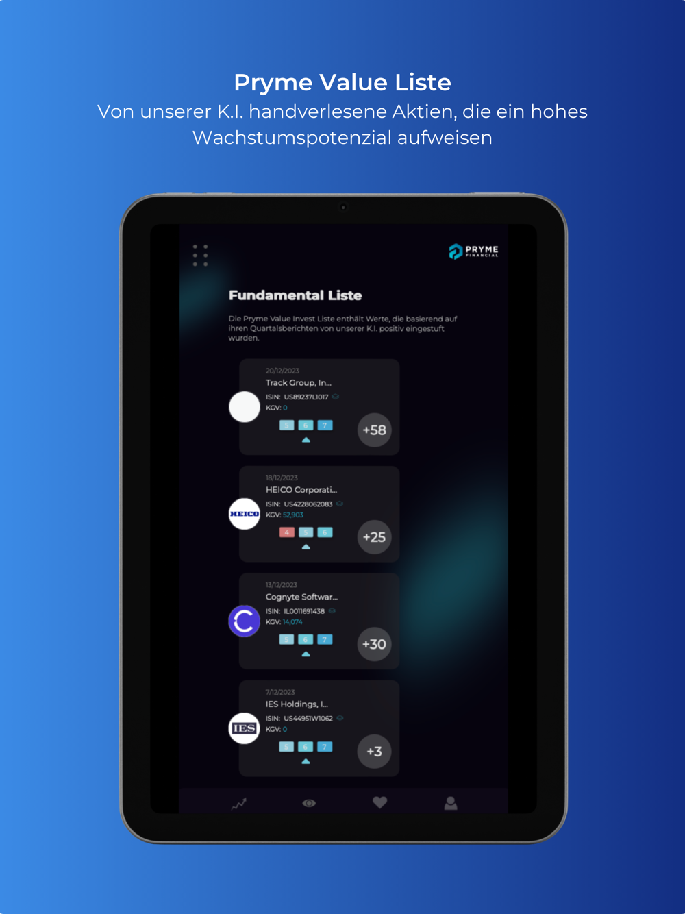 Möchtest du dein Trading optimieren und suchst nach soliden Strategien? Mit Pryme Financial erhältst du dank unserer einzigartigen K.I.-Technologie fundierte Anlageideen basierend auf den aktuellsten Quartalsberichten. Ob Neuling oder Profi, unsere App liefert dir zuverlässige Listen von Aktien, die unsere K.I. für vielversprechend hält.