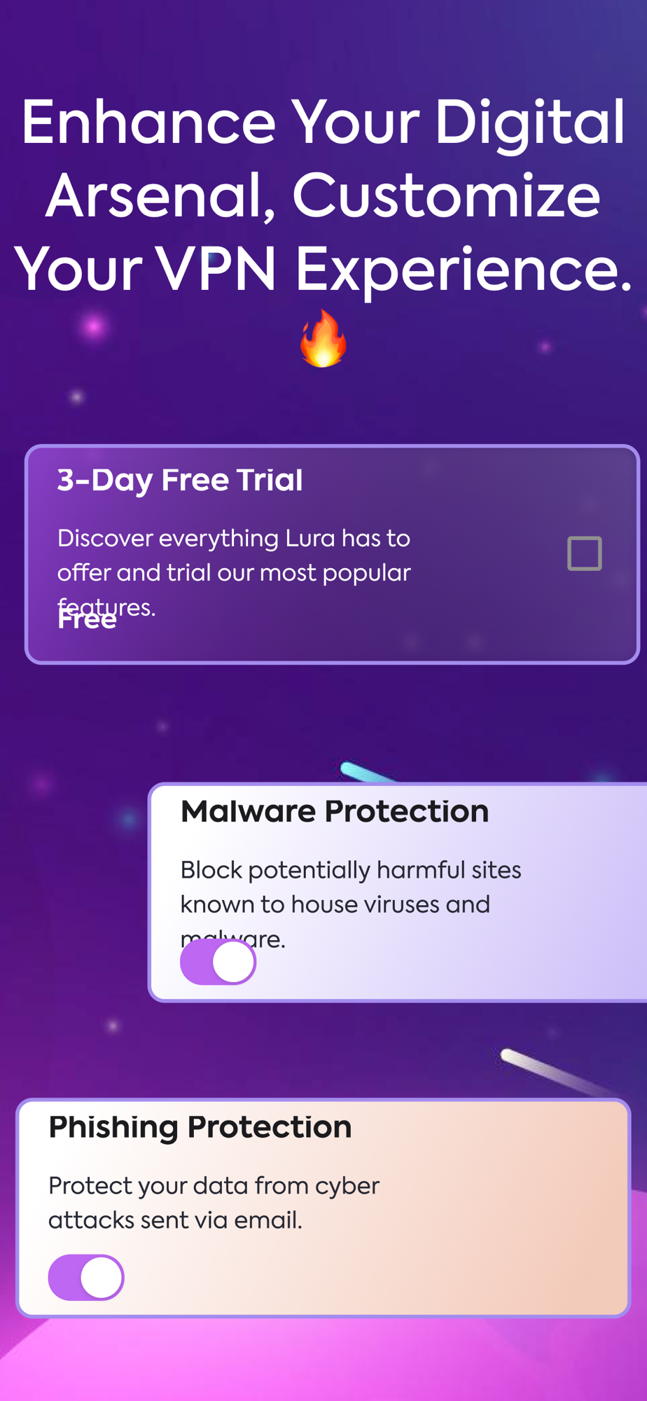 Experience the freedom of secure and private internet browsing with Lura VPN. Lura is key to unlocking a safer online world, safeguarding your data and privacy with cutting-edge encryption, advanced machine learning algorithms, and robust malware protection. With Lura VPN, you can confidently browse, stream, and connect to public Wi-Fi hotspots.