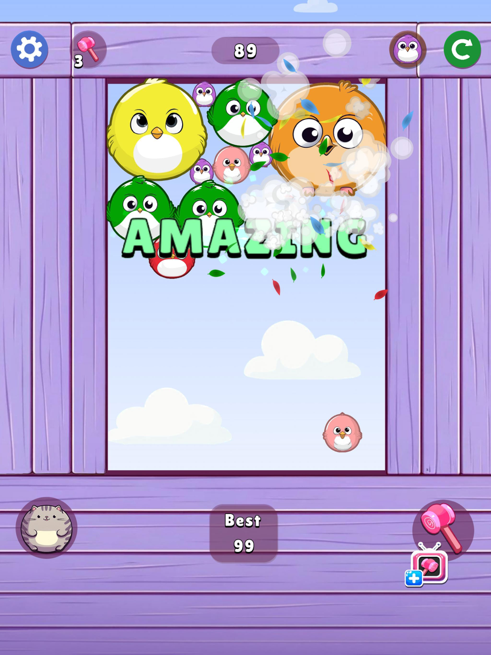 Strategize, Interact, Merge, Blast, and Expand! Drop the melon birds upward and witness the magical interaction when two birds of the same color touch each other. Through this interaction, the birds merge, giving rise to a larger, more uniquely colored bird. Start merging your birds from the ground up to create the biggest and most colorful birds! collect points, and activate your cat (Meow) helper who will come to your aid in the toughest of times.