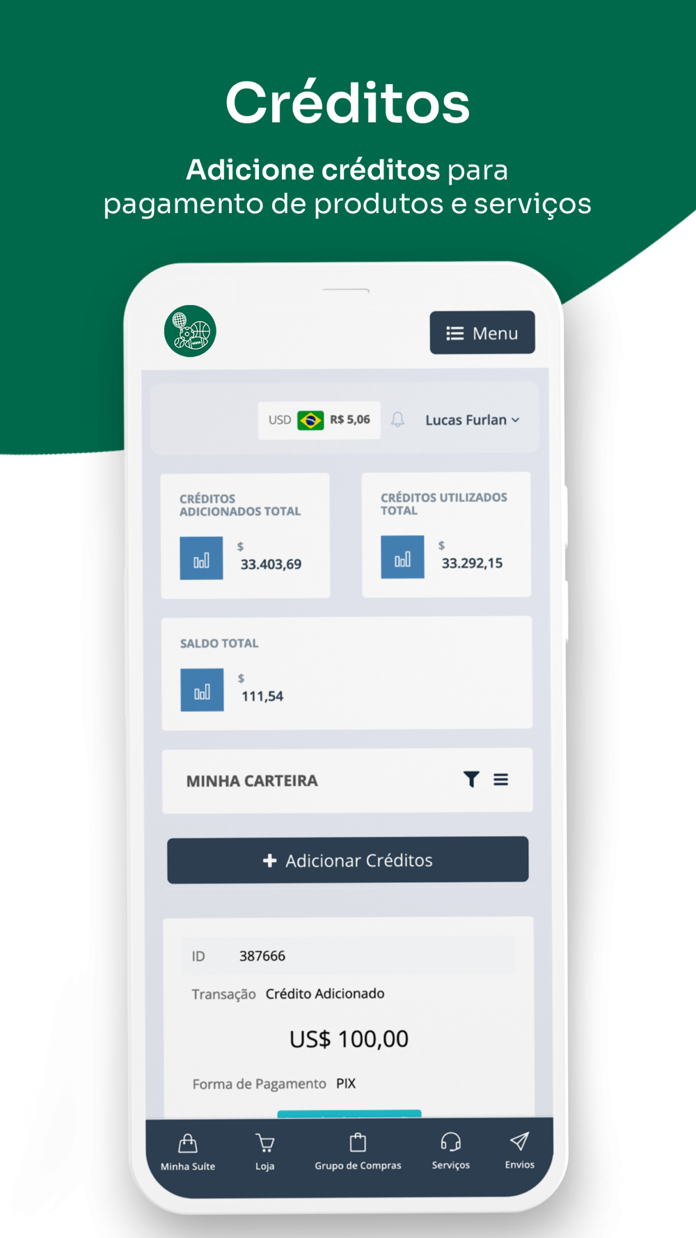A Esporte4Brasil possibilita que os usuários adicionem créditos à sua conta e calculem estimativas de frete para diferentes destinos e pesos de encomendas.