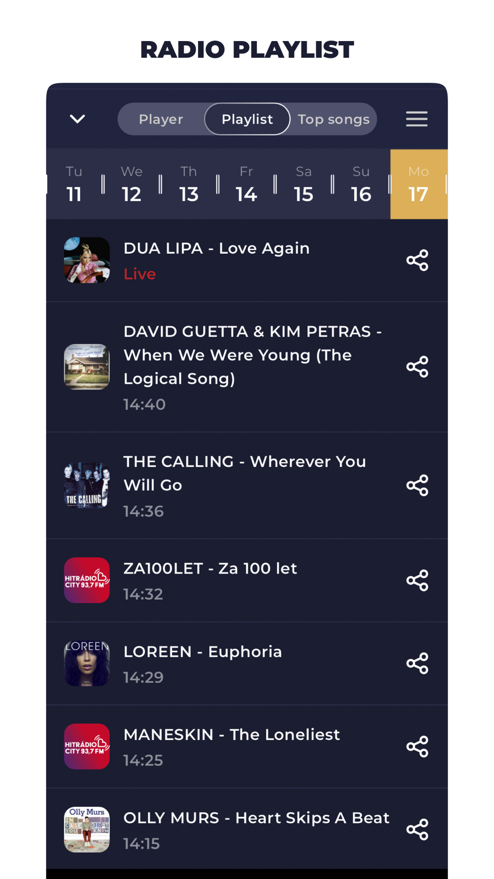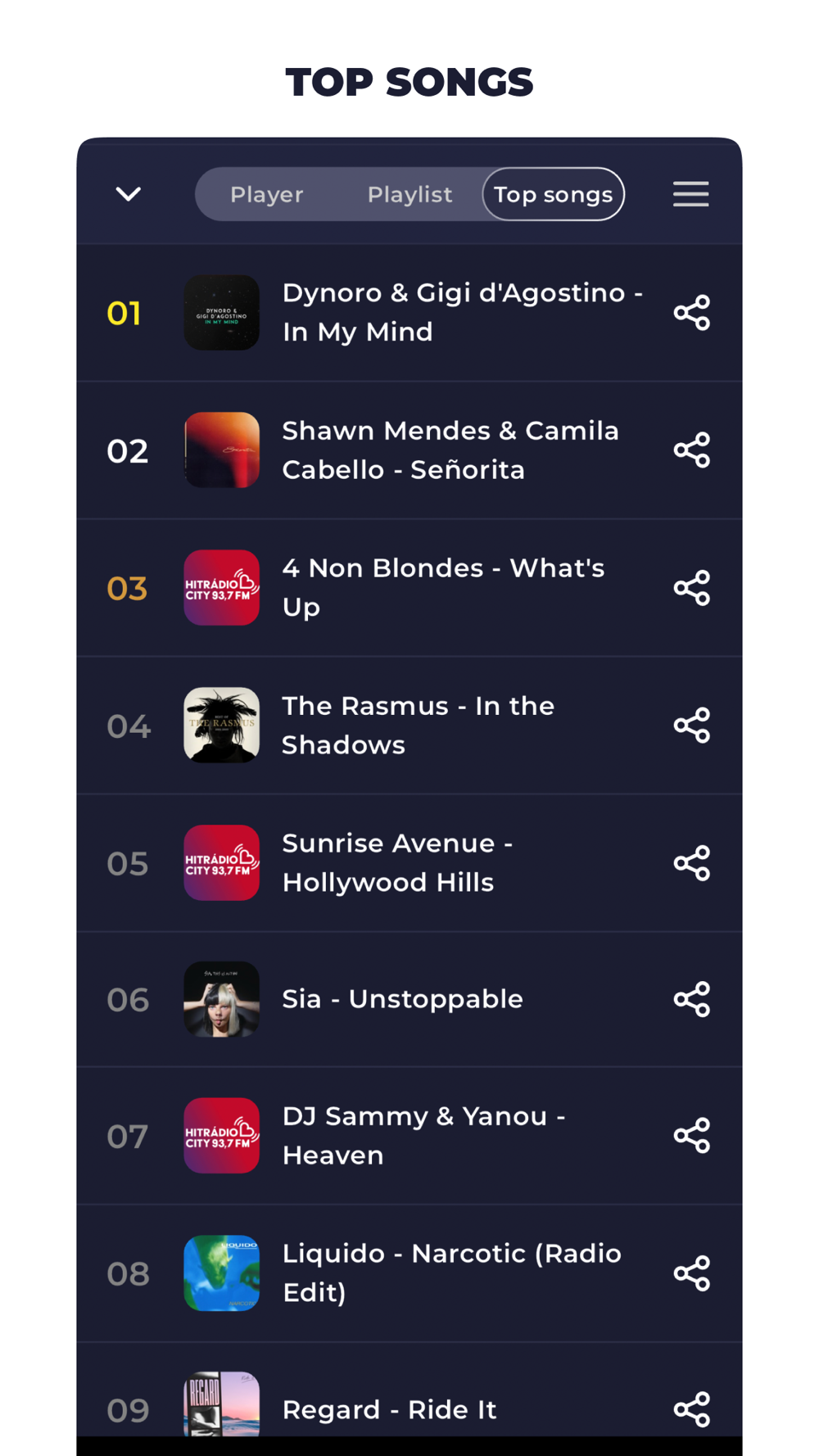Station Playlists and Top Songs: Explore station playlists and discover the top songs frequently played on each station, keeping you updated with the latest hits.