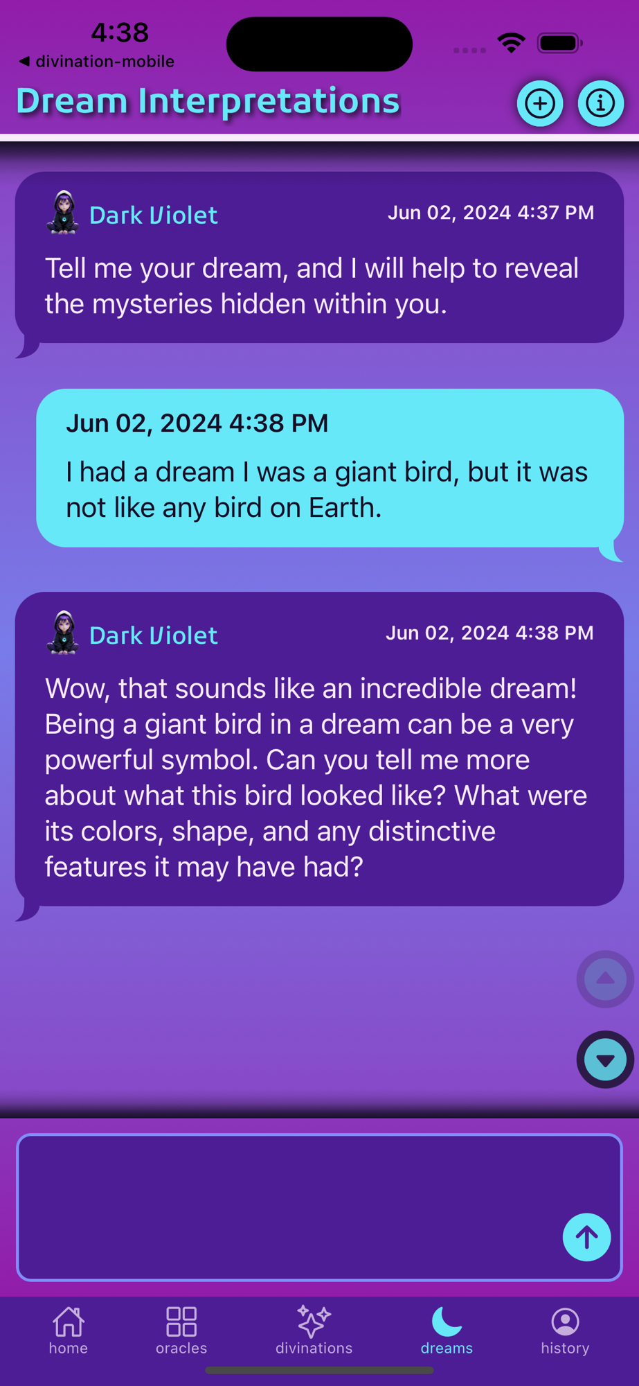 Step into a world where dreams and divinations intertwine, guided by the enigmatic Dark Violet. This isn't just an app; it's your personal portal to the mysteries of the cosmos, blending AI-powered dream analysis with a unique divination tool.