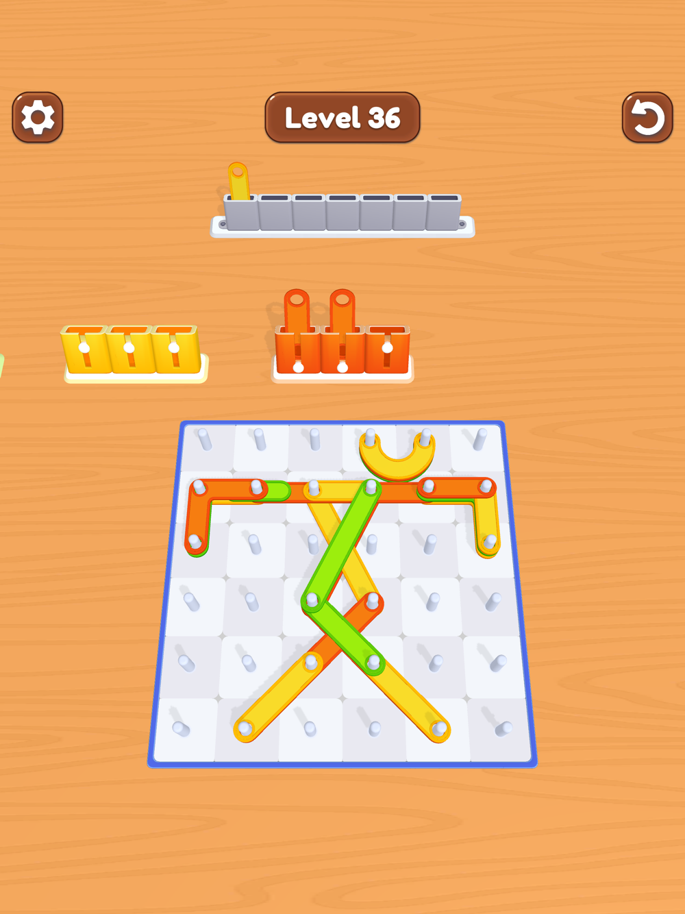 Remove the sticks from the pins and solve the puzzle! Match 3 sticks of the same colour and clear the whole area in these levels of fun shapes. You can only remove the ones with no other sticks on them. Place all the sticks in their boxes!