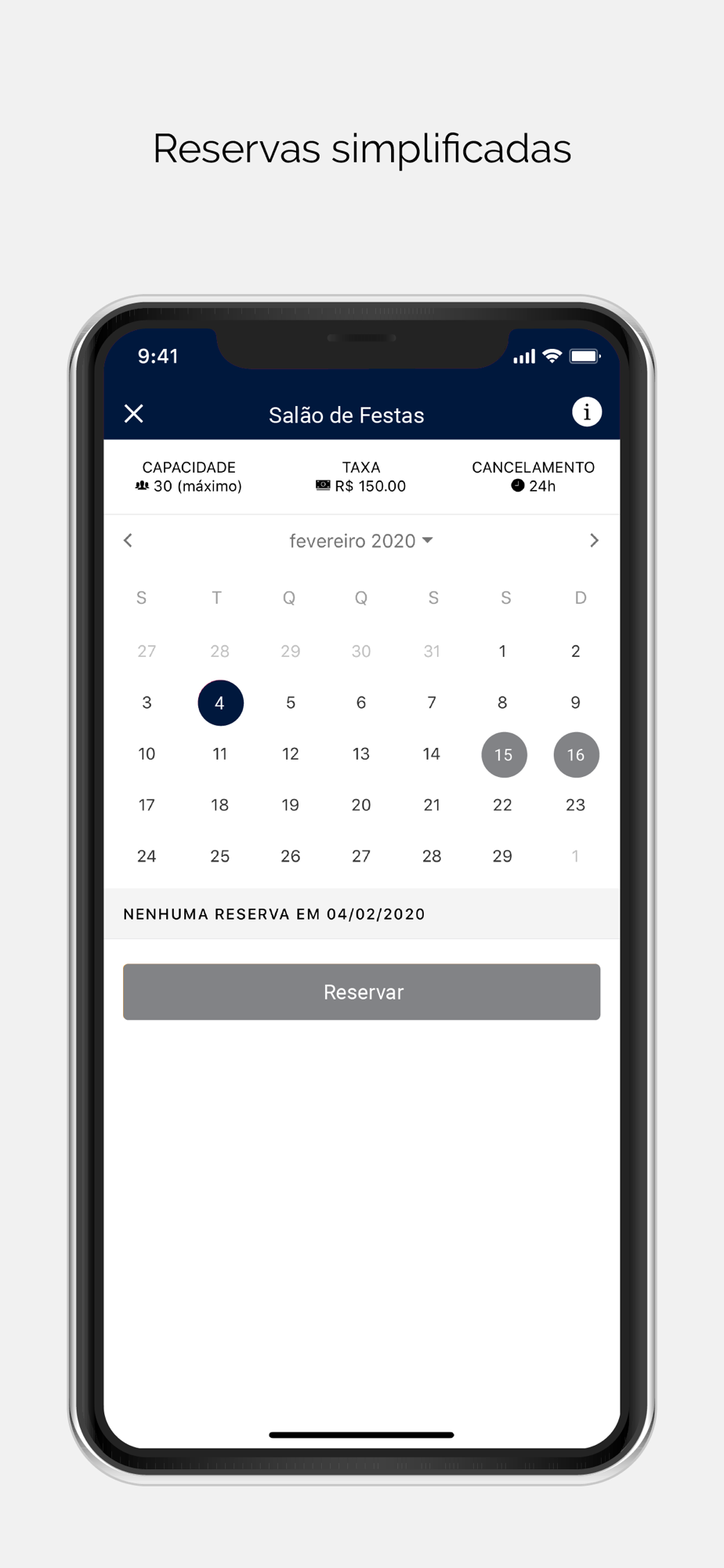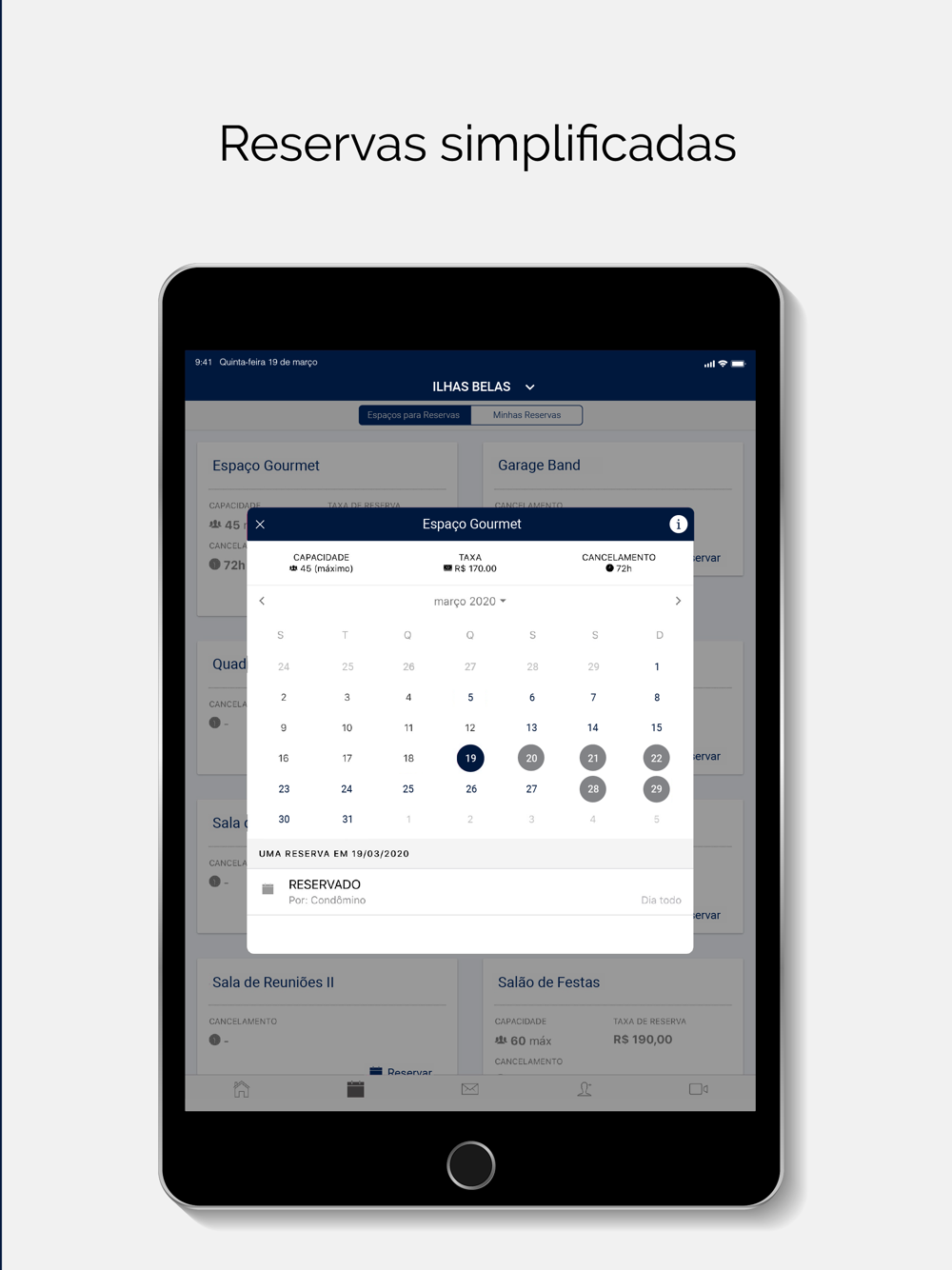 - reservas no salão de festas, mudanças e outras agendas,