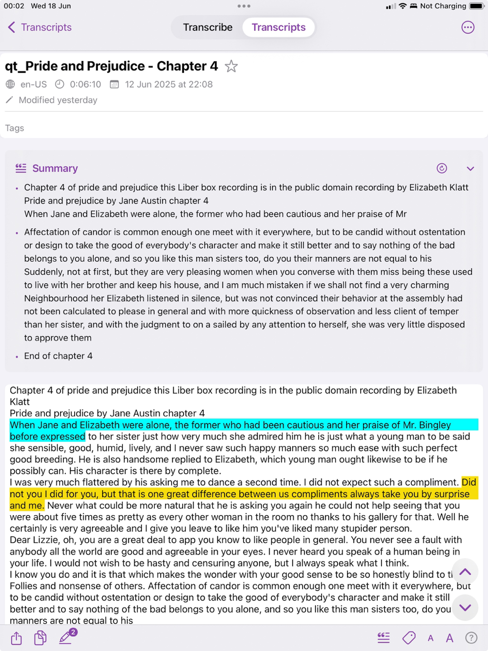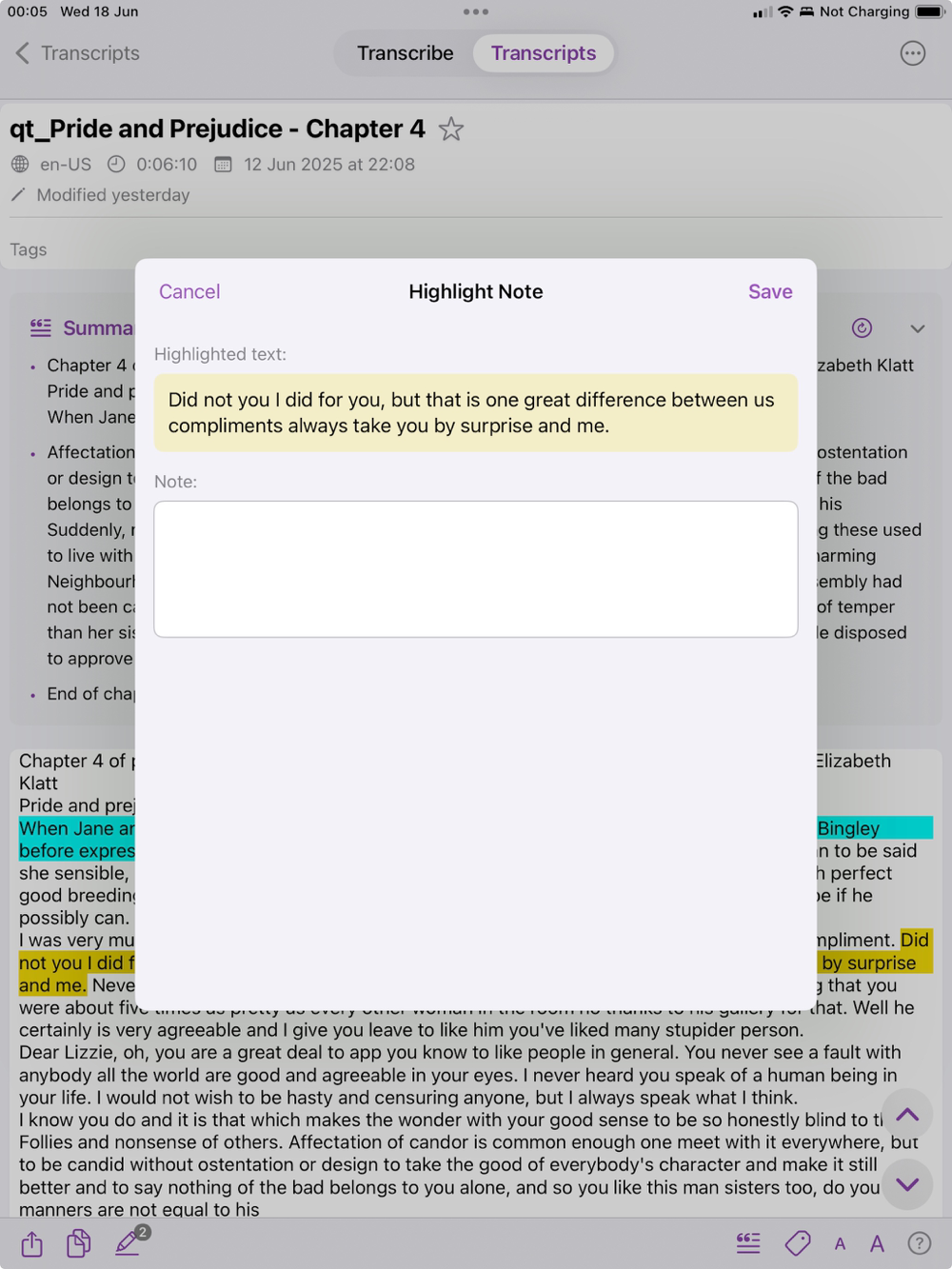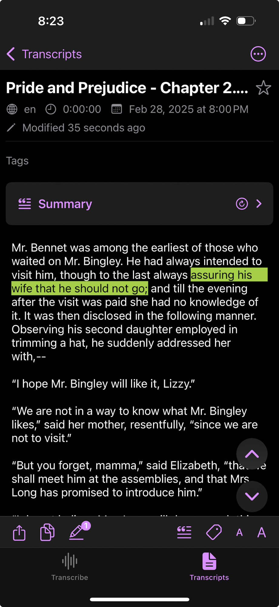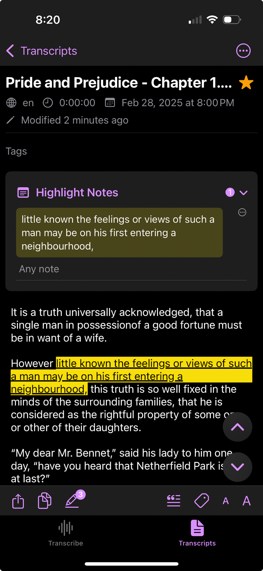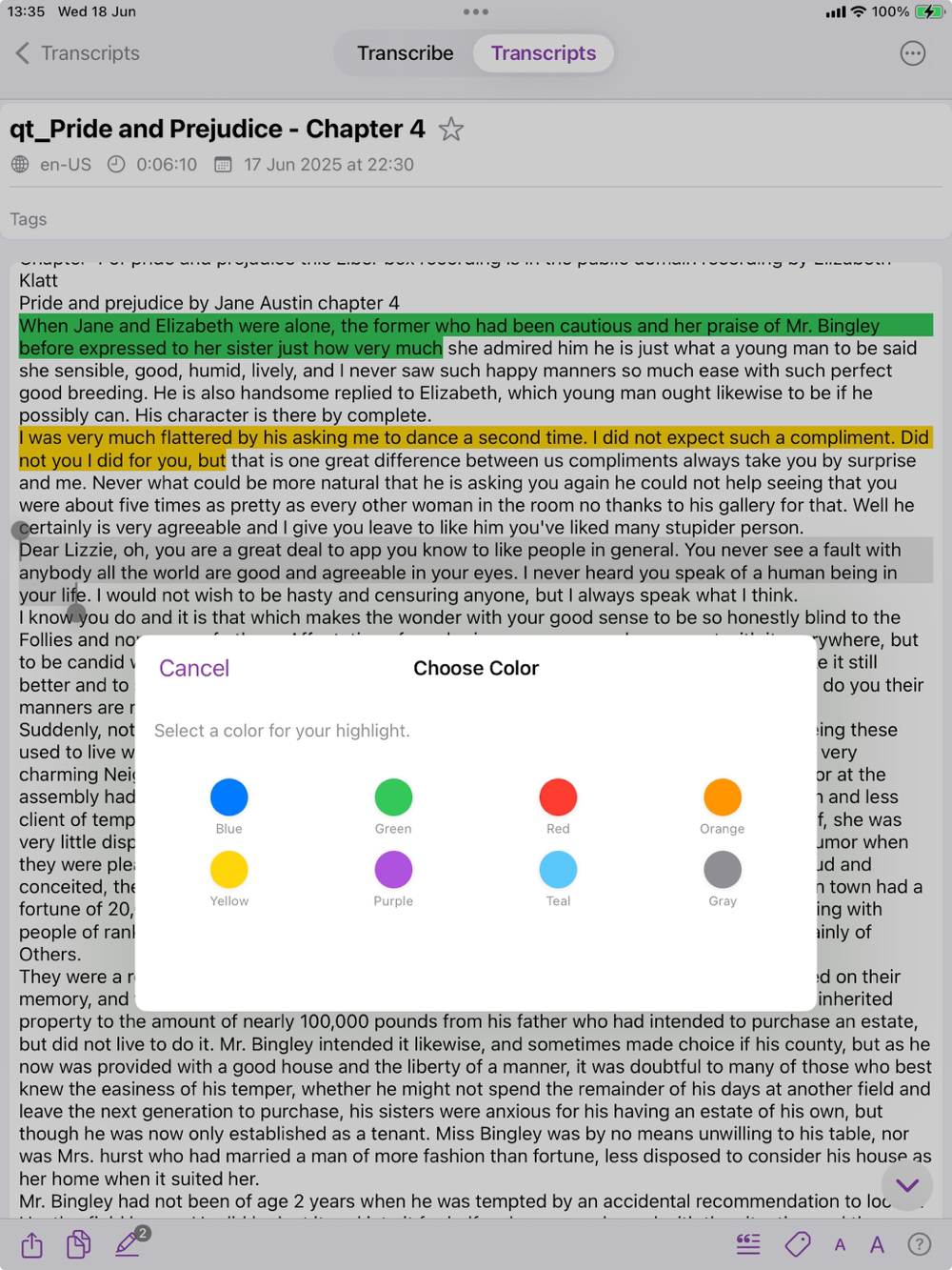 qTxt (quick text) is a powerful iOS application designed to convert speech to text with advanced editing and organization capabilities. The app provides a seamless experience for transcribing audio files, managing transcripts, and organizing content through tags and highlights. Simply select text and tap highlight icon to create a new highlight, or tap the tag icon to create a new tag.