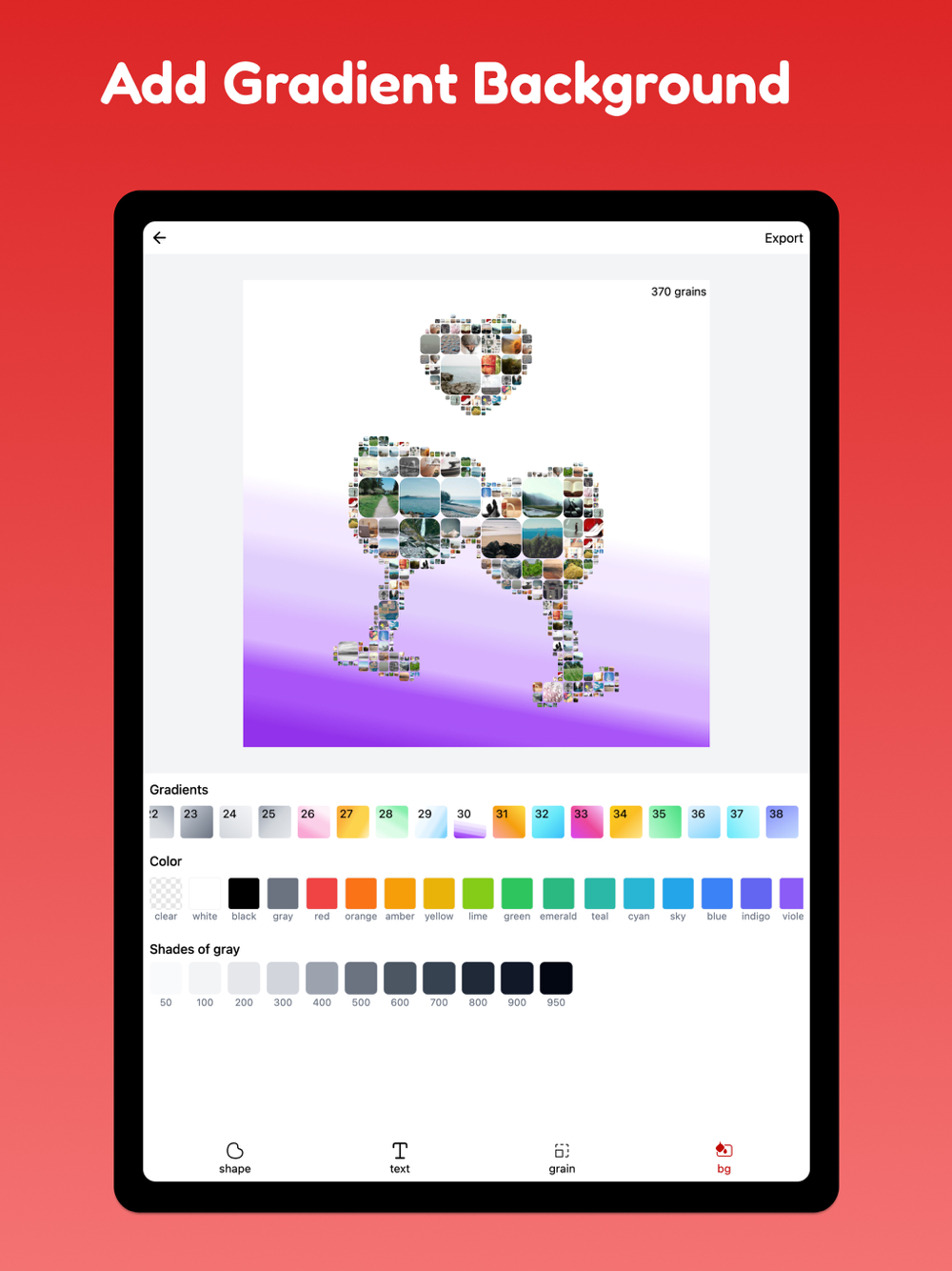 This application lets you to make collage of large number of photos. Ideal for events like graduation, birthday parties, anniversary etc. You can export with various backgrounds and gradients. You can also export in transparent background when using pro mode.