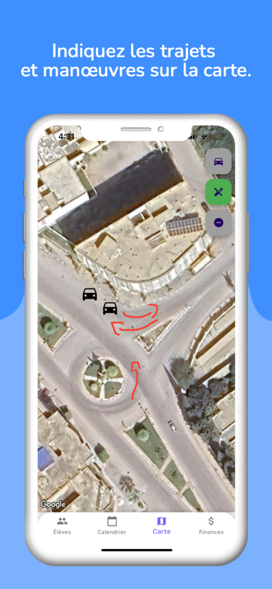 Simulez des situations de conduite réelles grâce à une carte interactive où vous pouvez dessiner des trajets, zones de manœuvre et points d’attention.