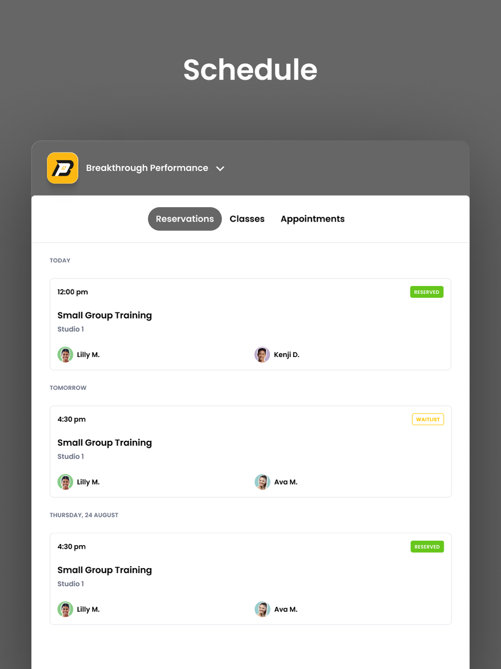 For members of Breakthrough Performance to reserve their place in a class, sign up for gym events, and general account management like updating headshots and credit card on file.