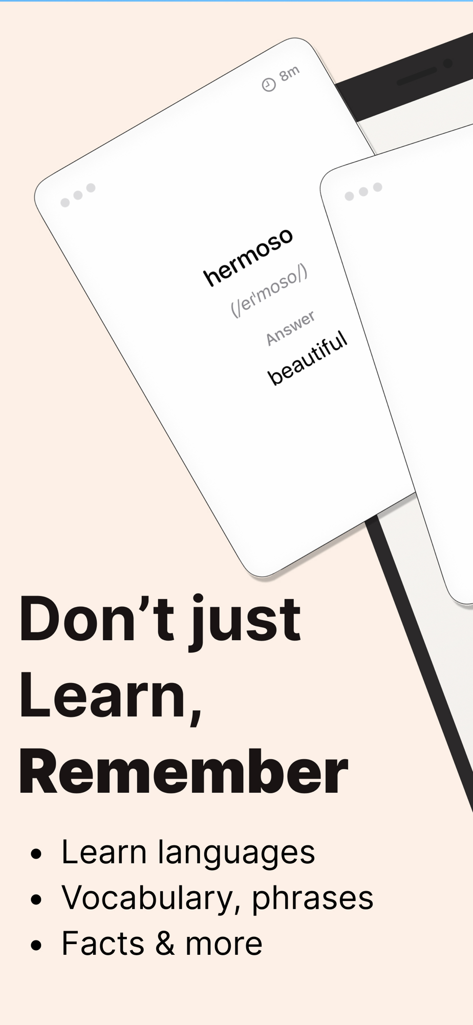 Transform your language learning, or general journey with Don't Forget, the intelligent vocabulary, phrase, and fact memorization app that adapts to your unique learning style. Using advanced AI flashcards and scientifically-proven spaced repetition, Don't Forget ensures you remember what you learn - permanently.