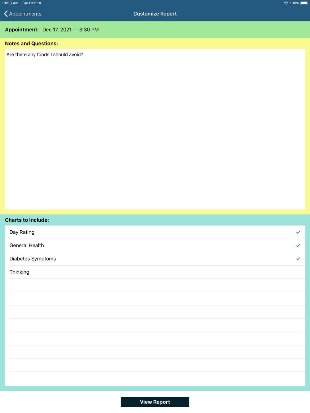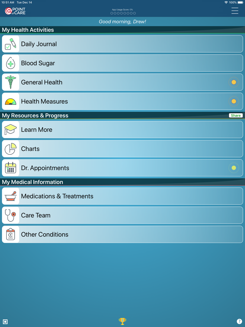 When you are living with Diabetes, the Diabetes Health Manager can help you manage the symptoms that affect you every day. Studies show that people with chronic diseases can positively affect their lives by using @Point of Care apps to track pain, medications, and more—giving a sense of control over their conditions.