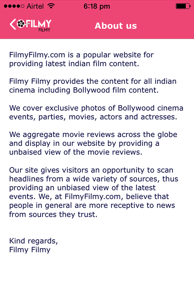 Filmy Filmy is a popular bollywood site for latest indian movie news, bollywood reviews, hindi trailers, gossip, juicy headlines, box office updates, launches, screening, events, fashion update. Visit the app to get up to date information of bollywood.