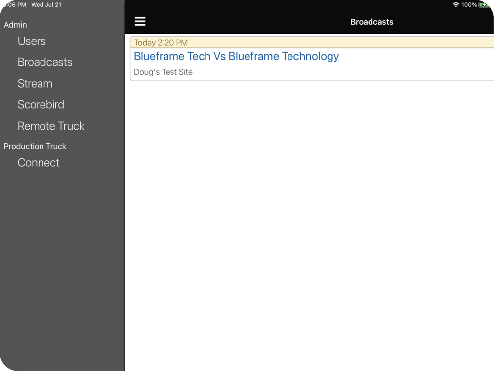 Remote Truck is a distributed production application to be used alongside Production Truck®, the Hudl® production and live streaming software. Managing the production of a live video stream can require more than one user. Remote Truck aims to facilitate multiple users on independent devices. Production Truck® acts as the hub of communication and facilitates the assignment of Remote Truck sessions to production functions including ad insertions, audio adjustment, and camera selection.